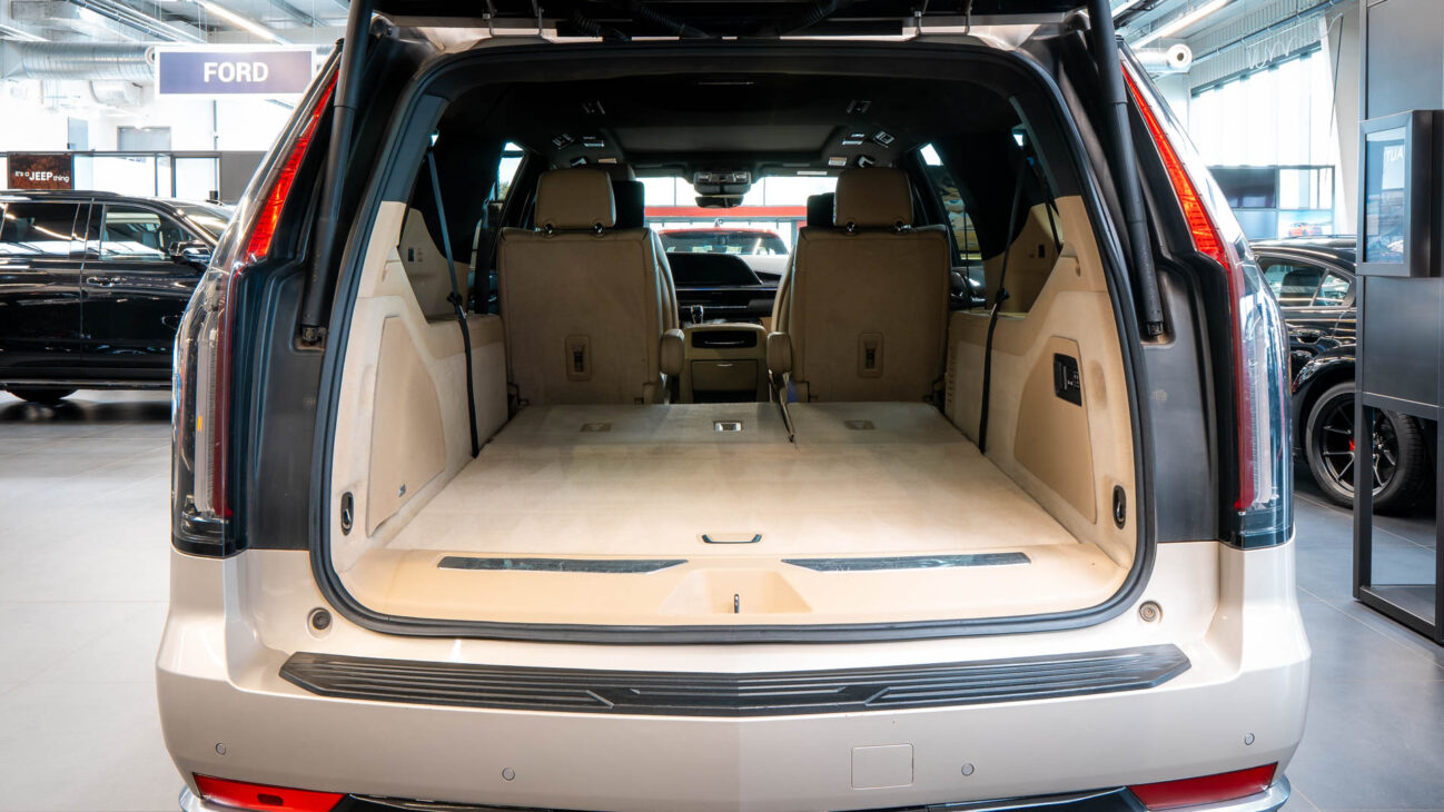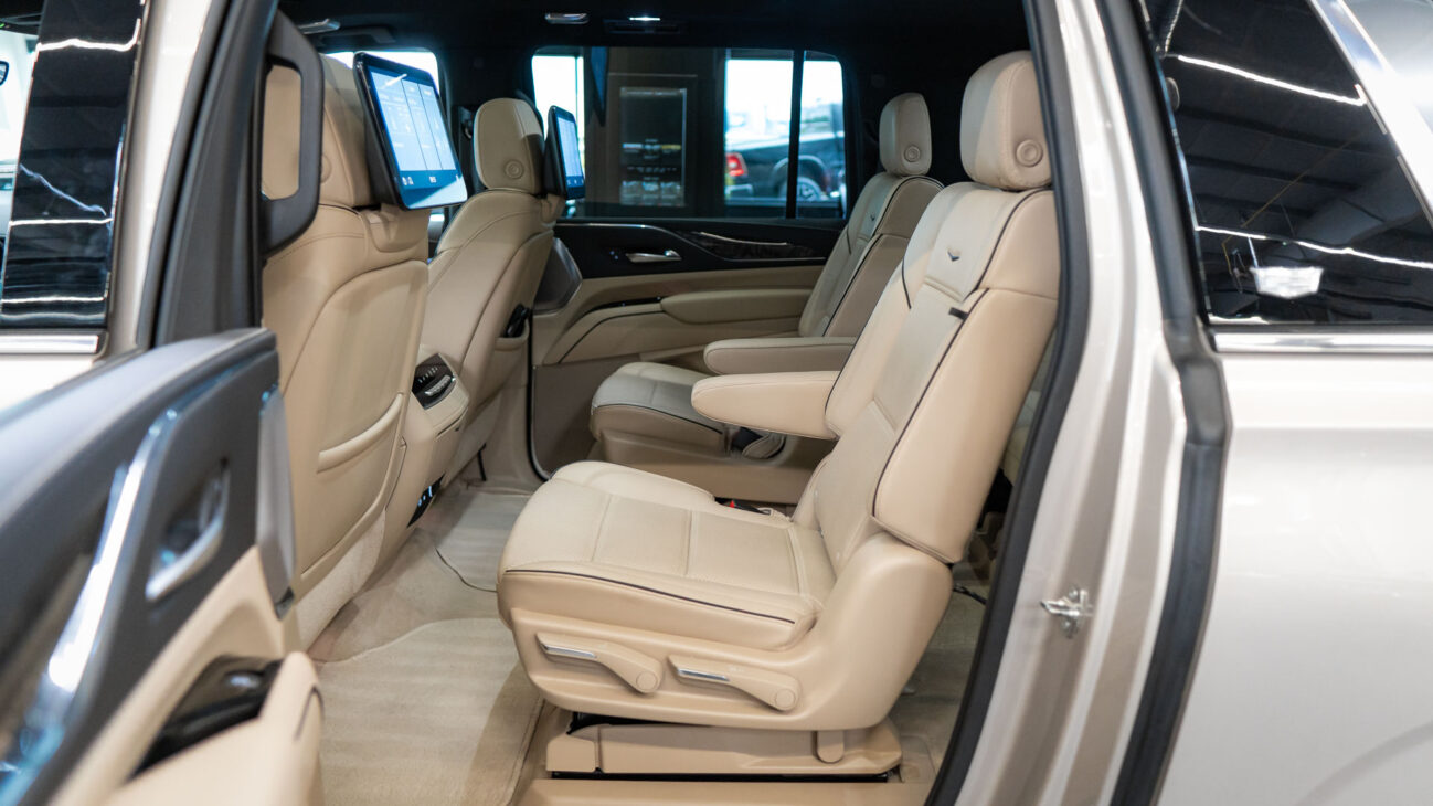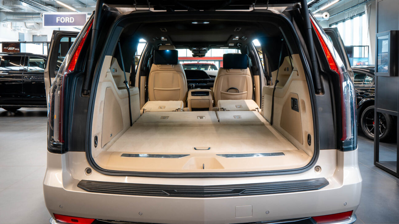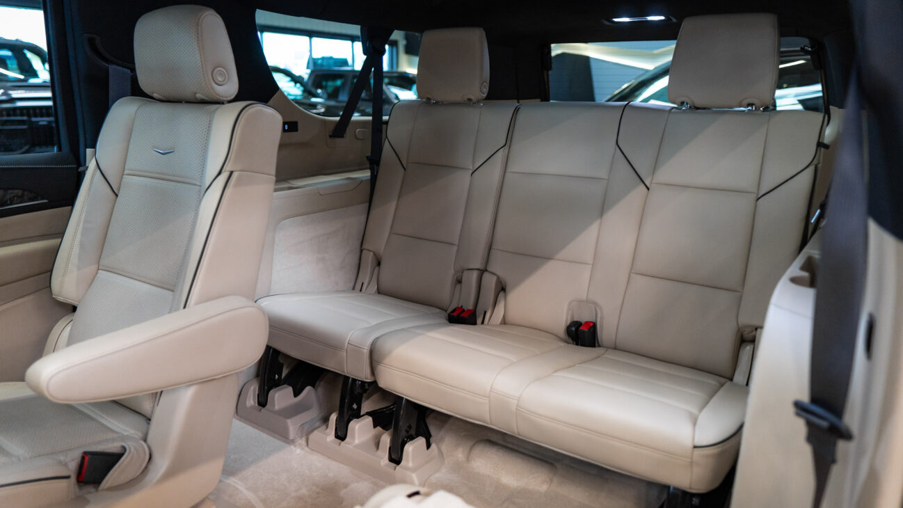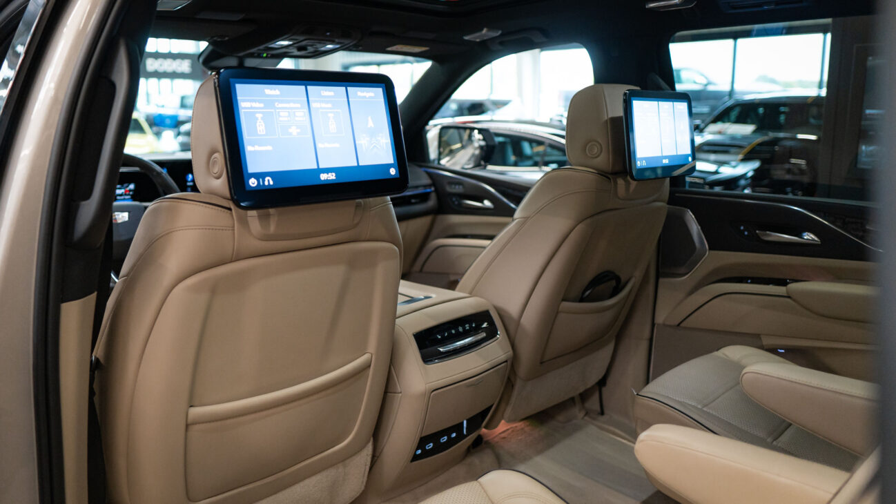 The Premium Luxury trip has a first class 6 seat interior in full perforated leather. First row seats are both heated and ventilated while offering 12-way adjustment. Heated second row seats. Luxurious infotainment system consists of a huge 16,9″ OLED touch screen and fully digital 14,2″ driver cluster. Rear media center includes two 12,6″ screens with HDMI/USB connectivity and option to project media from mobile devices. The set includes a premium quality Cadillac wireless headphones.
