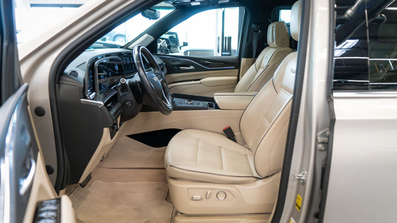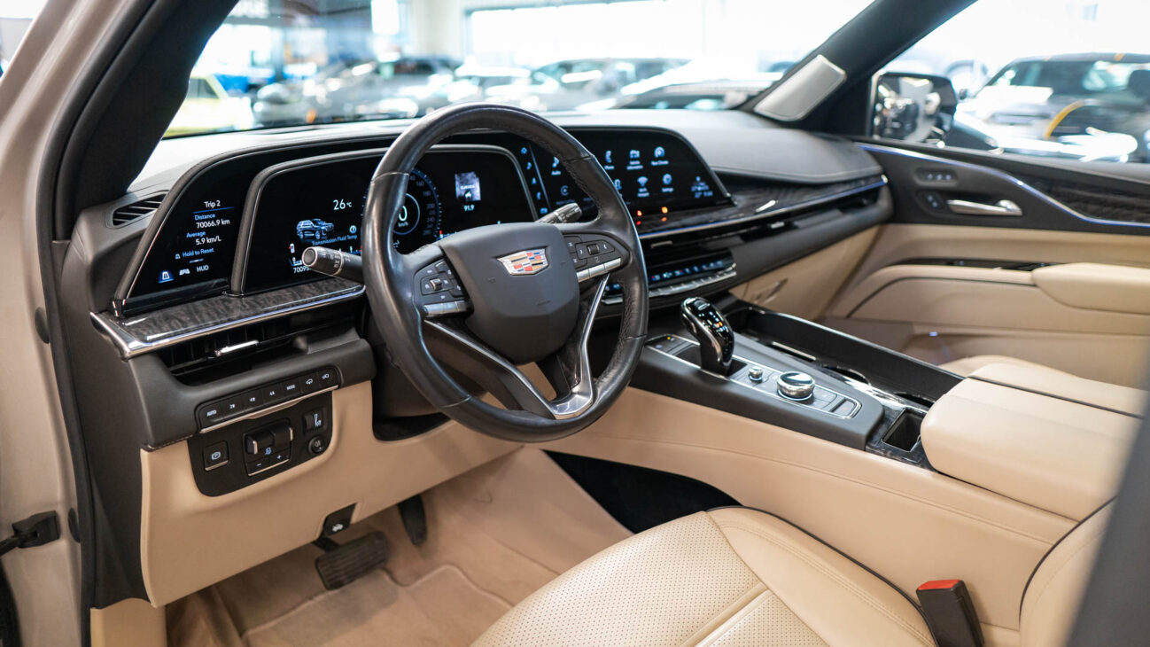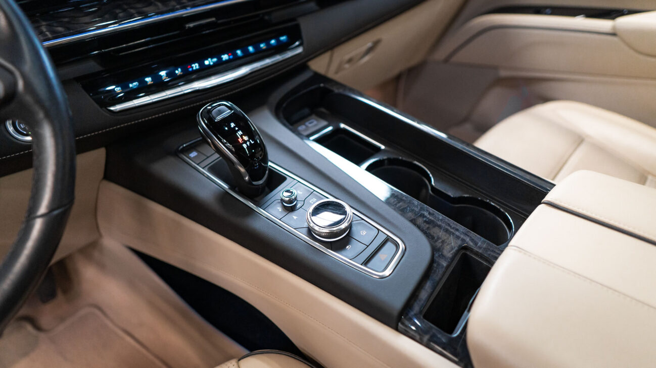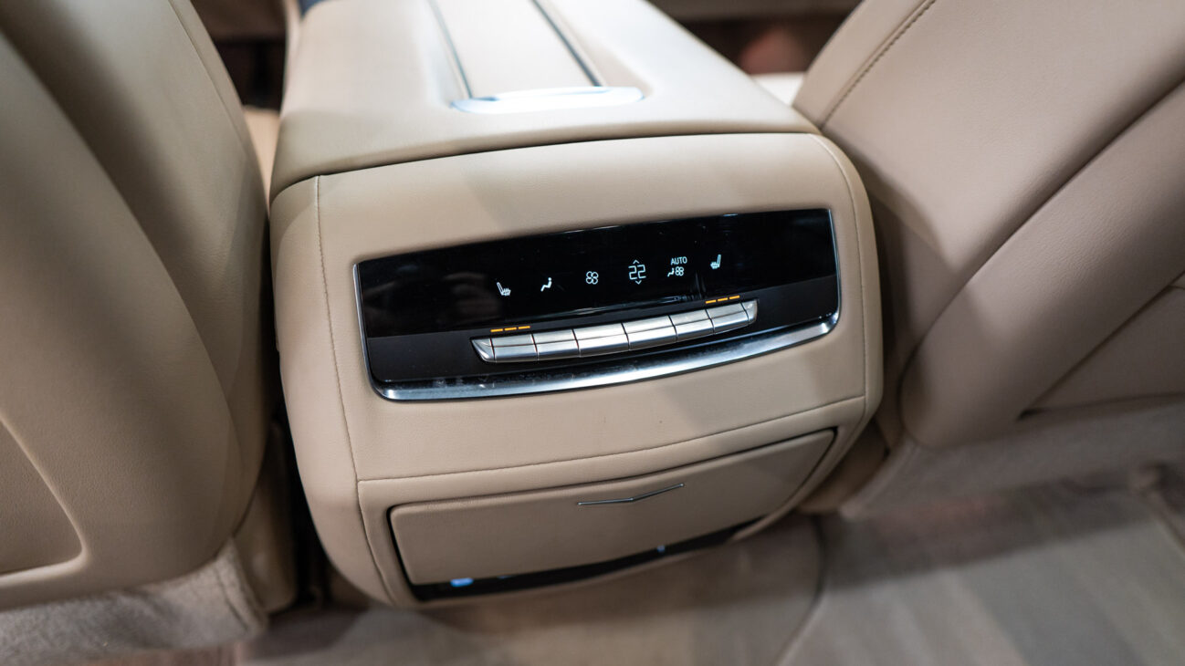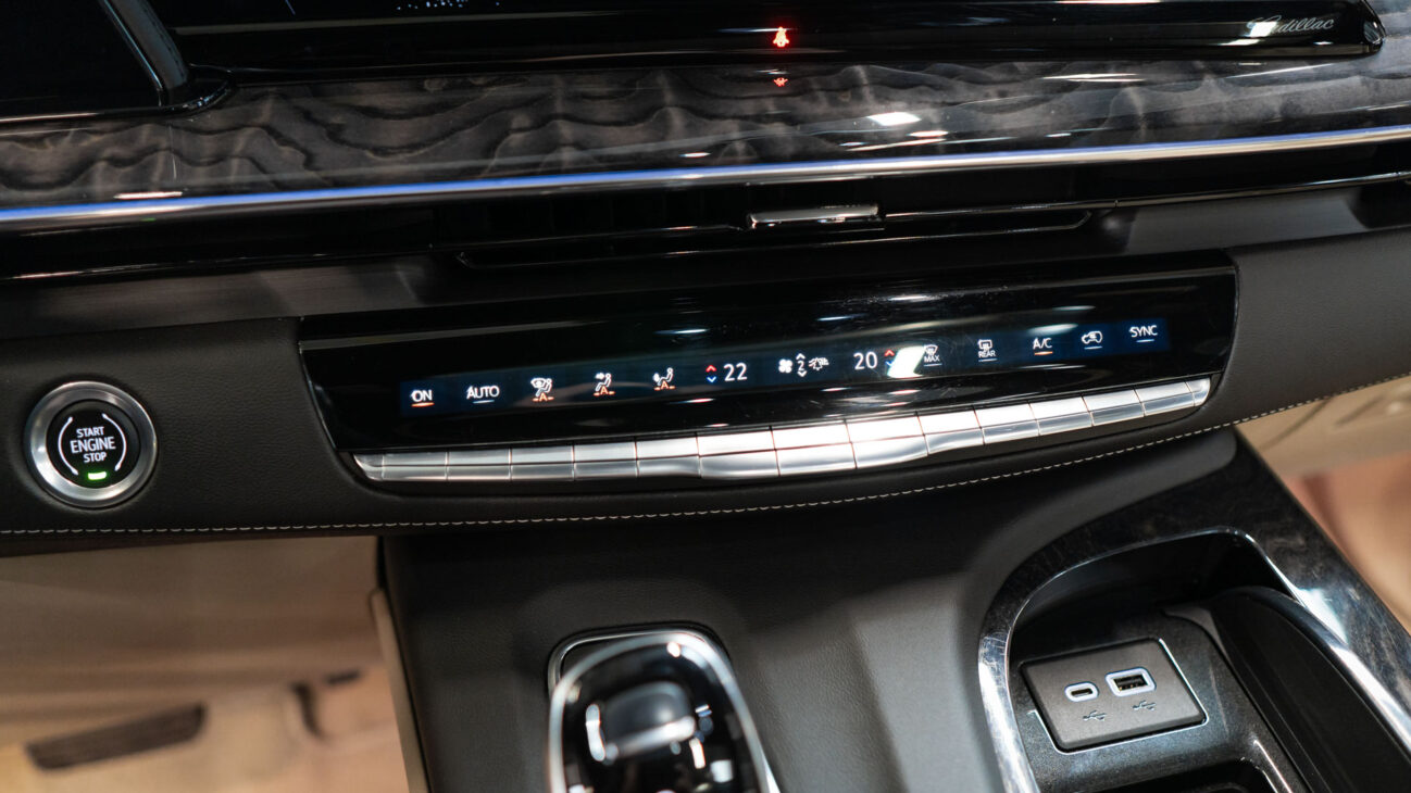 The Premium Luxury trip has a first class 6 seat interior in full perforated leather. First row seats are both heated and ventilated while offering 12-way adjustment. Heated second row seats. Luxurious infotainment system consists of a huge 16,9″ OLED touch screen and fully digital 14,2″ driver cluster. Rear media center includes two 12,6″ screens with HDMI/USB connectivity and option to project media from mobile devices. The set includes a premium quality Cadillac wireless headphones.