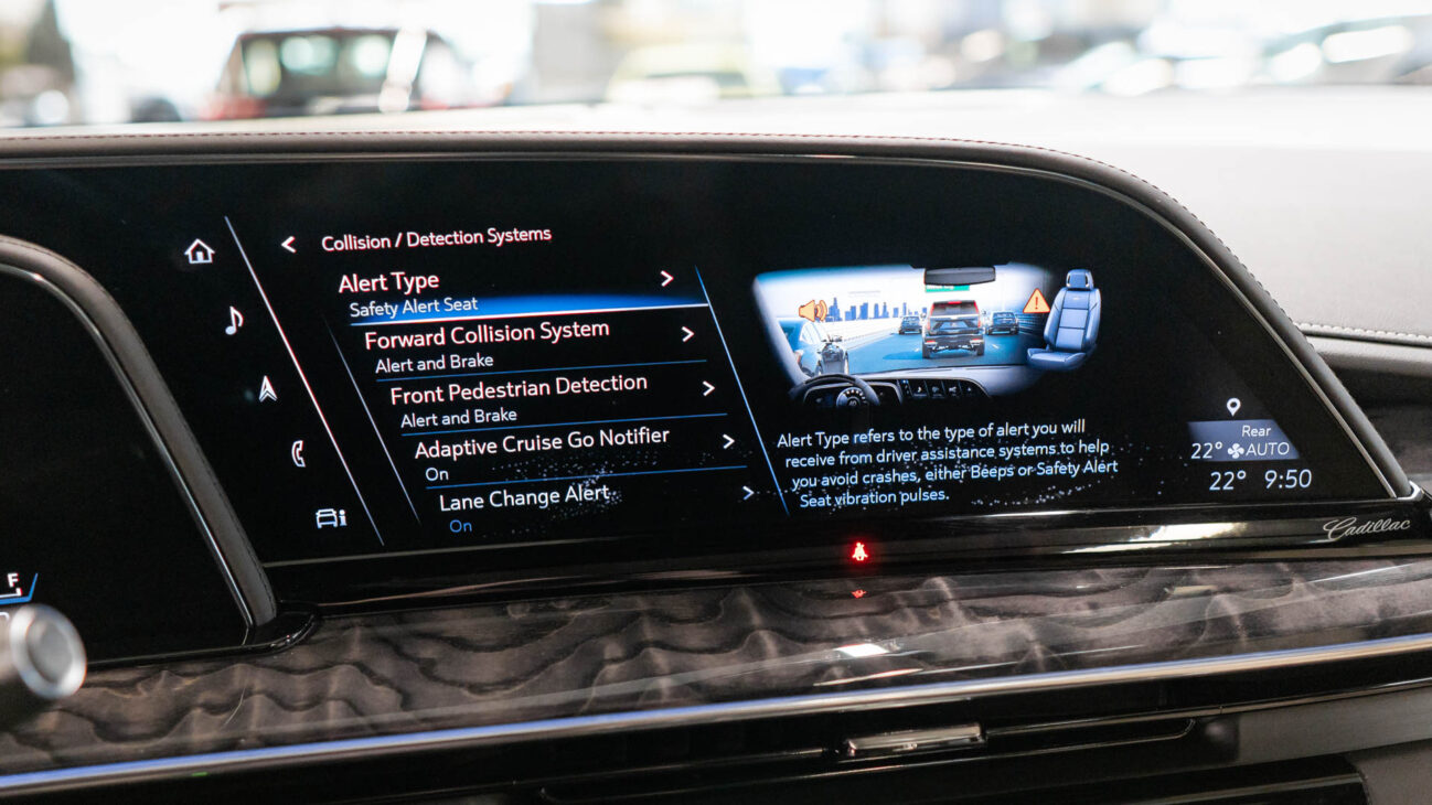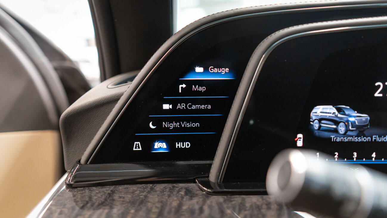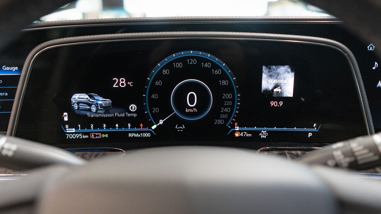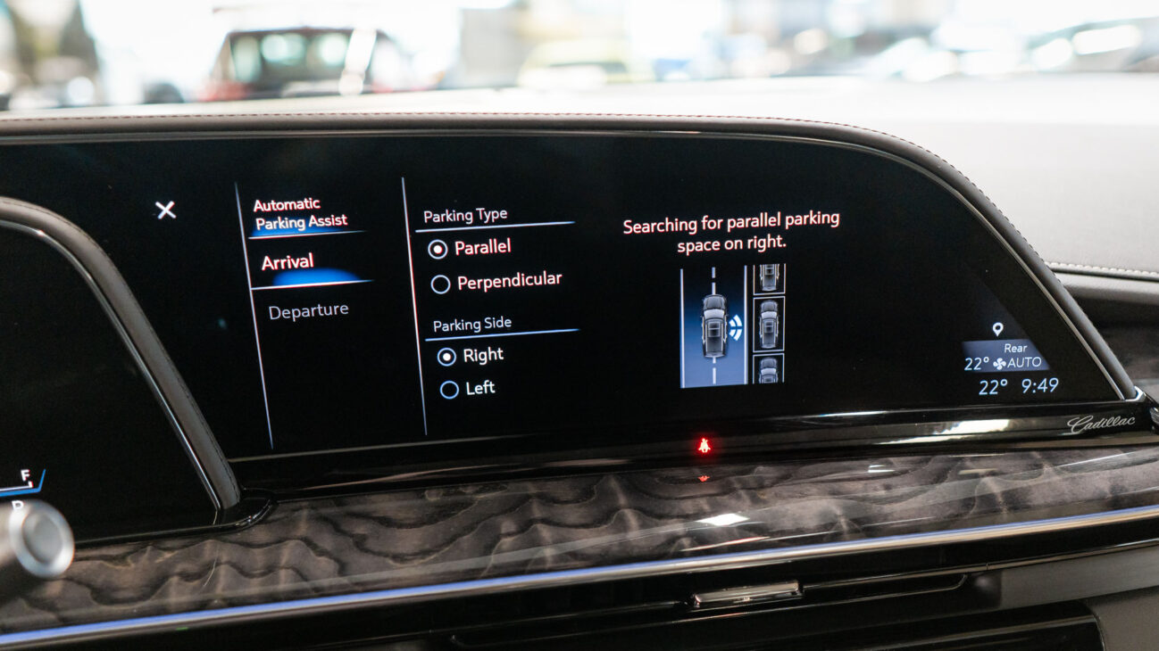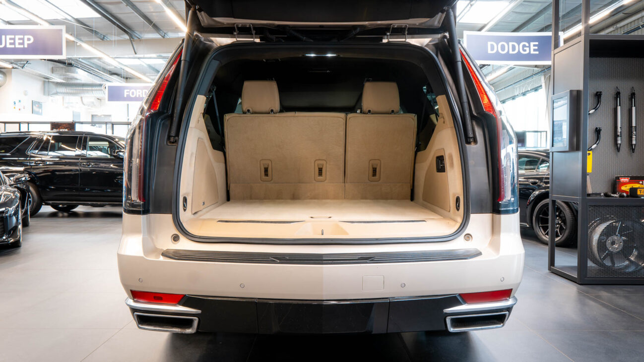The Premium Luxury trip has a first class 6 seat interior in full perforated leather. First row seats are both heated and ventilated while offering 12-way adjustment. Heated second row seats. Luxurious infotainment system consists of a huge 16,9″ OLED touch screen and fully digital 14,2″ driver cluster. Rear media center includes two 12,6″ screens with HDMI/USB connectivity and option to project media from mobile devices. The set includes a premium quality Cadillac wireless headphones.