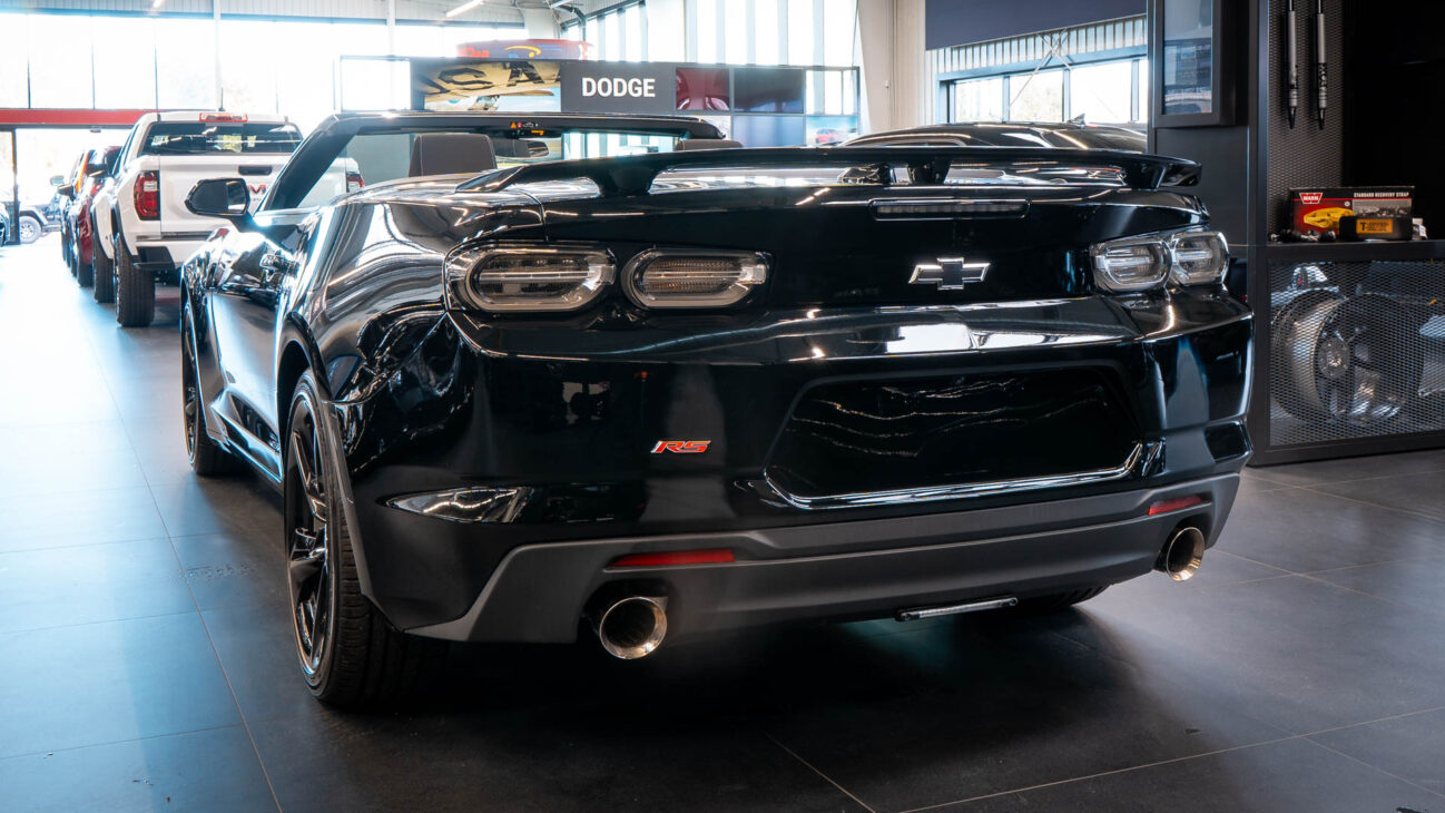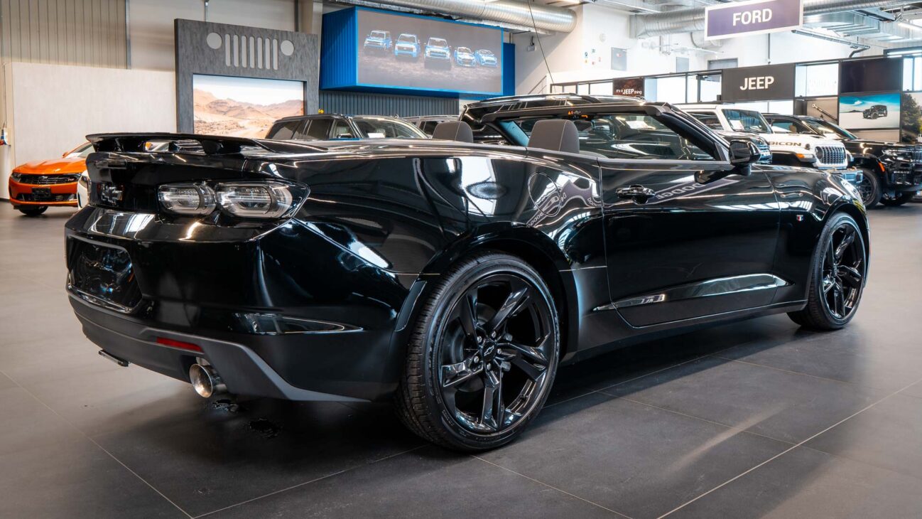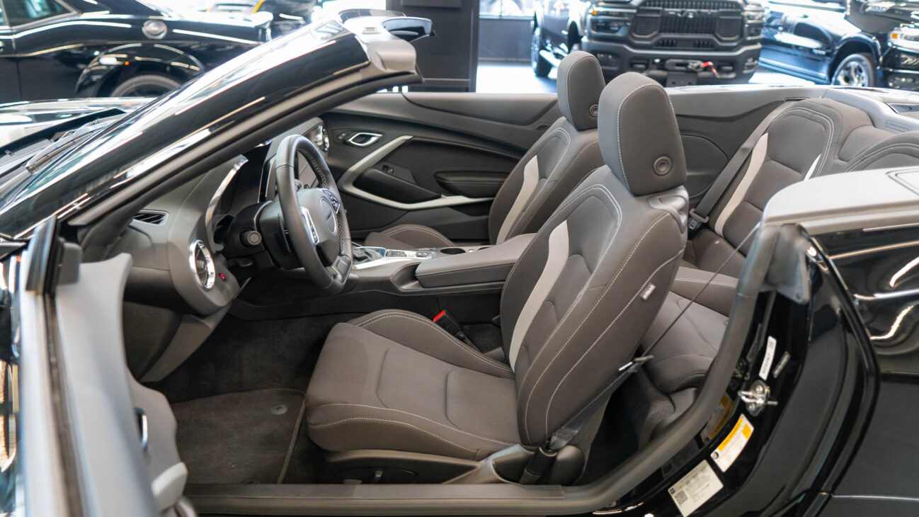 On the exterior, the Camaro is distinguished by 20-inch gloss black aluminum wheels, an aggressive black front grille, and LED headlamps with daytime running lights. The rear is complemented by a subtle decklid spoiler. The power-operated soft-top roof opens or closes in approximately 18–20 seconds via a console-mounted switch and can even be operated while driving at speeds up to 48 km/h (30 mph).