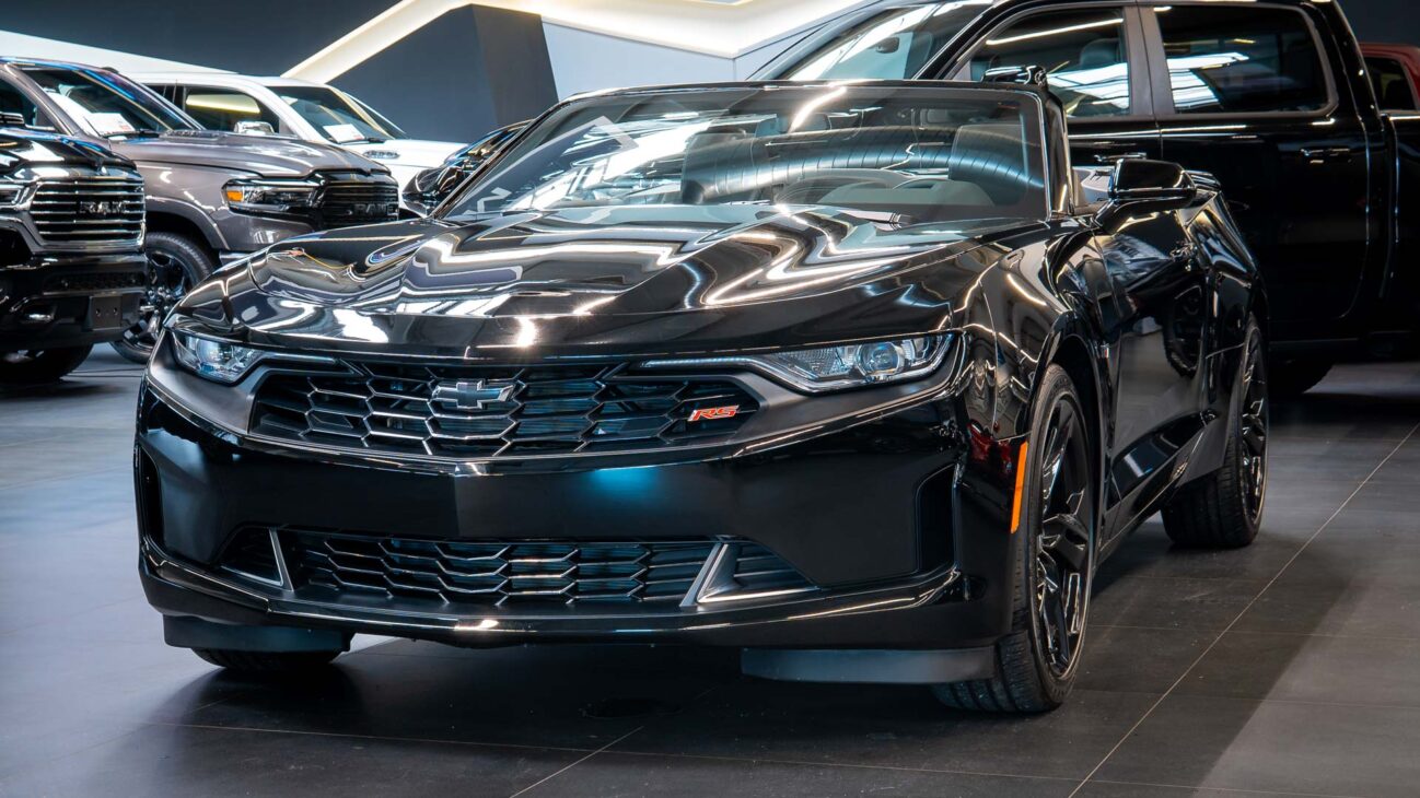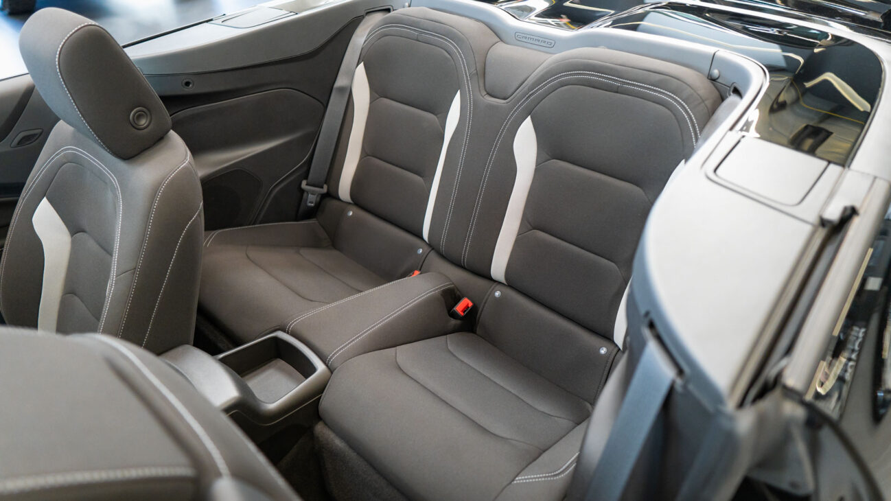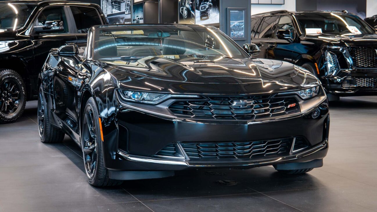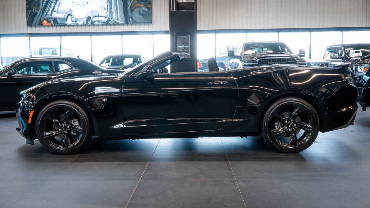 On the exterior, the Camaro is distinguished by 20-inch gloss black aluminum wheels, an aggressive black front grille, and LED headlamps with daytime running lights. The rear is complemented by a subtle decklid spoiler. The power-operated soft-top roof opens or closes in approximately 18–20 seconds via a console-mounted switch and can even be operated while driving at speeds up to 48 km/h (30 mph).