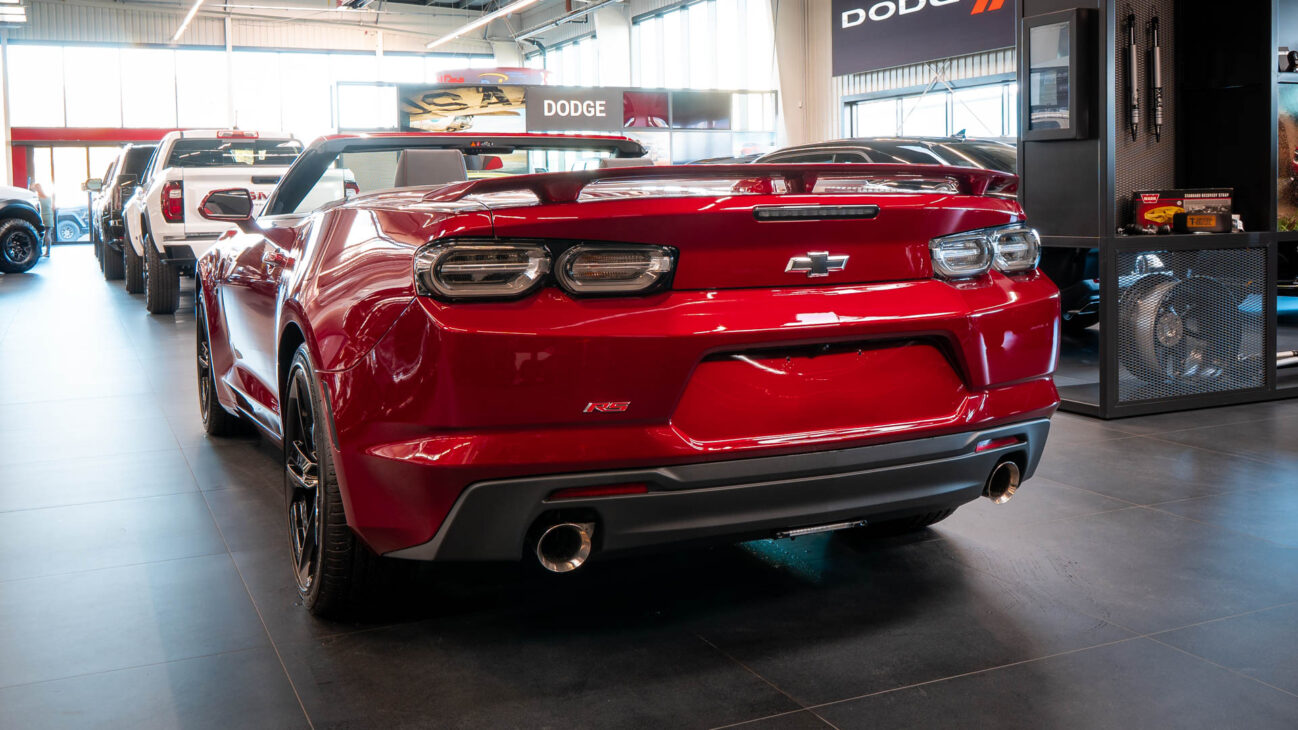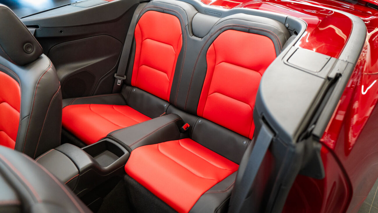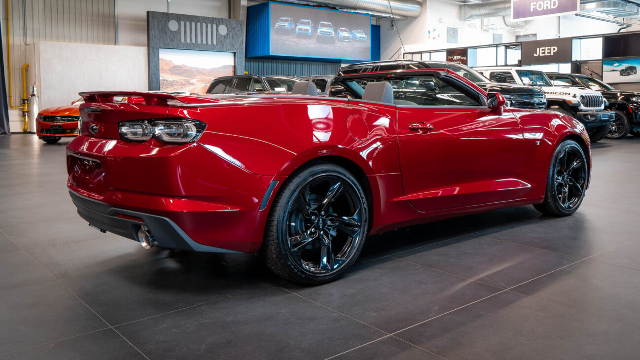 On the exterior, the Camaro is distinguished by 20-inch gloss black aluminum wheels, an aggressive black front grille, and LED headlamps with daytime running lights. The rear is complemented by a subtle decklid spoiler. The power-operated soft-top roof opens or closes in approximately 18–20 seconds via a console-mounted switch and can even be operated while driving at speeds up to 48 km/h (30 mph).