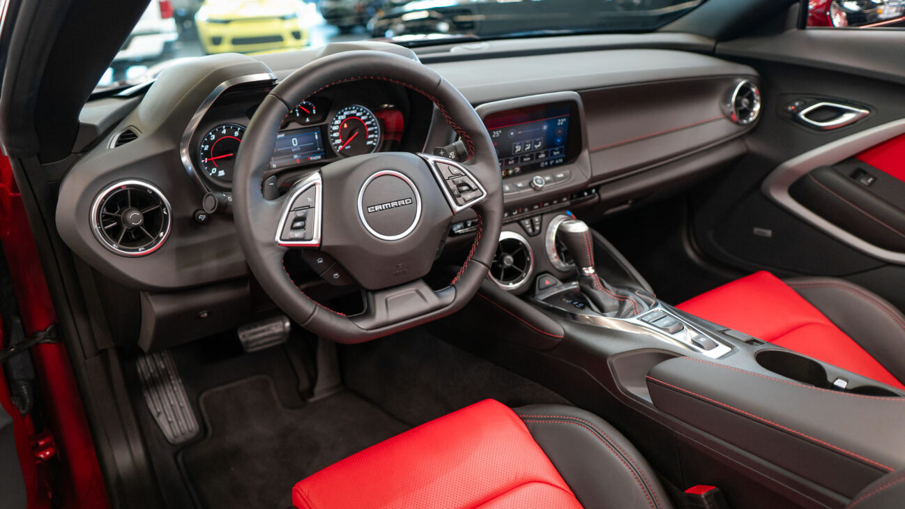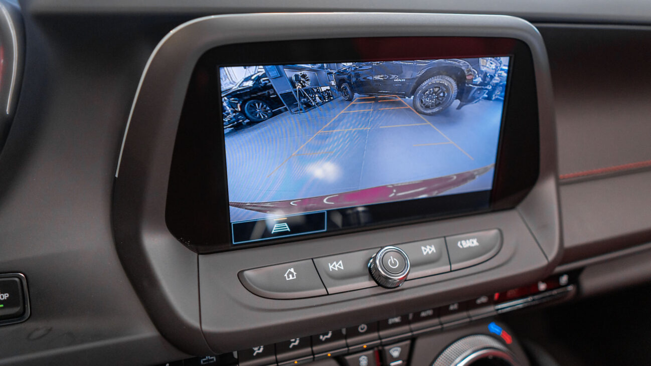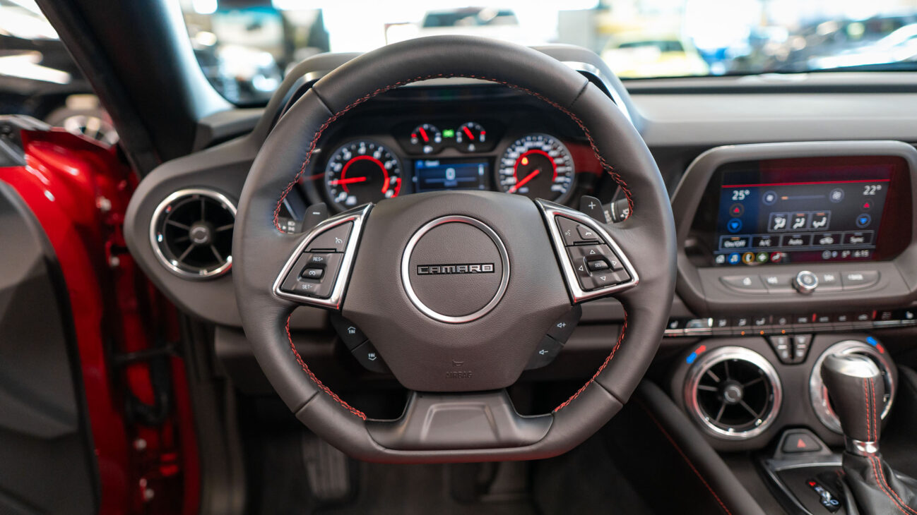 The interior of the 2LT model is fully upholstered in fine leather. The front sport seats feature perforated surfaces and are equipped with both heating and ventilation features. Comfort is further enhanced by 8-way power adjustability for the driver and 6-way power adjustability for the passenger. The sport multifunction steering wheel is leather-wrapped with a thick rim and offers two-way adjustability. The crew has dual-zone automatic air conditioning at their disposal. As part of the Technology Package, the Camaro comes with a premium Bose audio system with 9 speakers, the advanced Chevrolet Infotainment 3 system with an 8-inch touchscreen, and wireless support for Apple CarPlay and Android Auto. The vehicle is also equipped with keyless entry and push-button start.