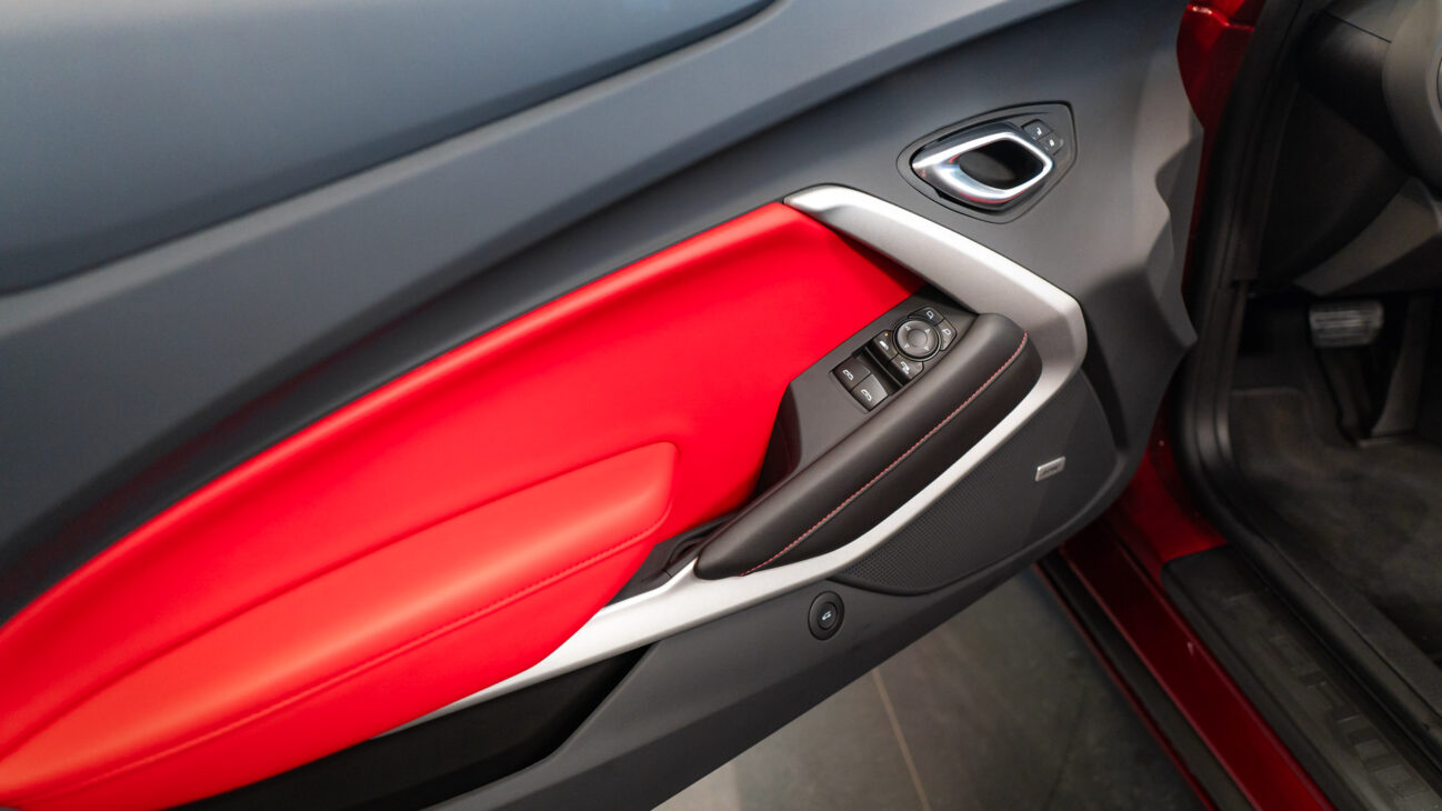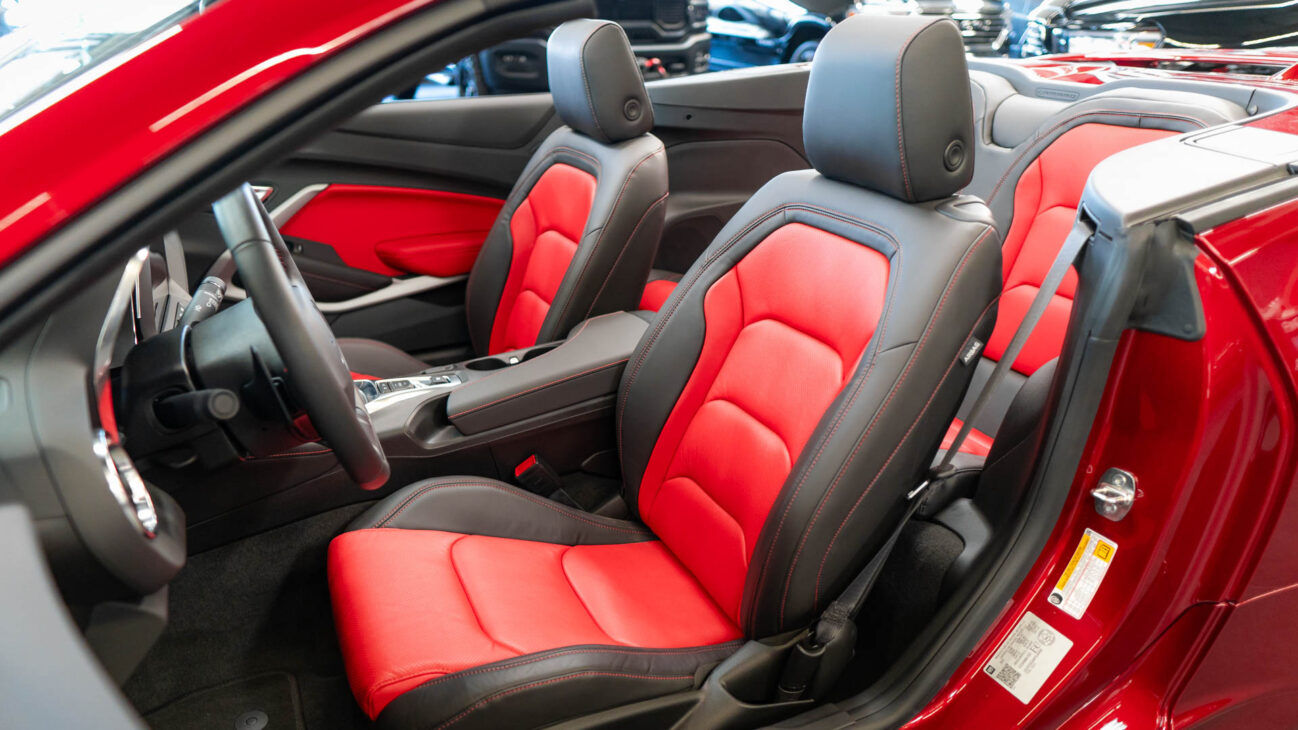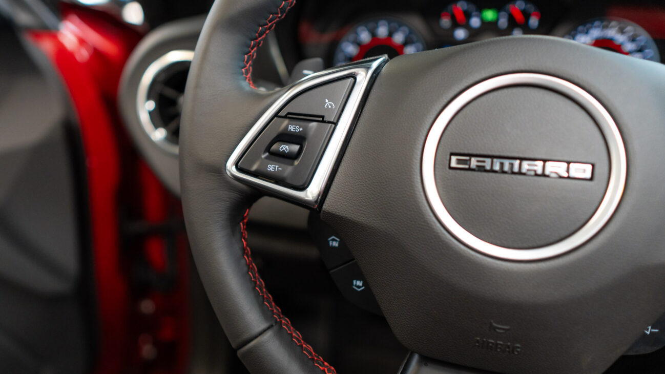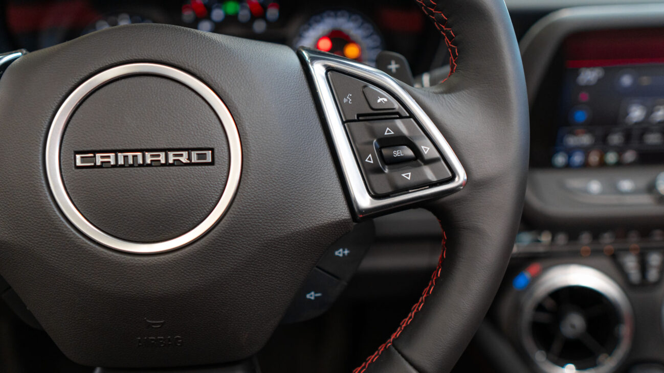 The interior of the 2LT model is fully upholstered in fine leather. The front sport seats feature perforated surfaces and are equipped with both heating and ventilation features. Comfort is further enhanced by 8-way power adjustability for the driver and 6-way power adjustability for the passenger. The sport multifunction steering wheel is leather-wrapped with a thick rim and offers two-way adjustability. The crew has dual-zone automatic air conditioning at their disposal. As part of the Technology Package, the Camaro comes with a premium Bose audio system with 9 speakers, the advanced Chevrolet Infotainment 3 system with an 8-inch touchscreen, and wireless support for Apple CarPlay and Android Auto. The vehicle is also equipped with keyless entry and push-button start.
