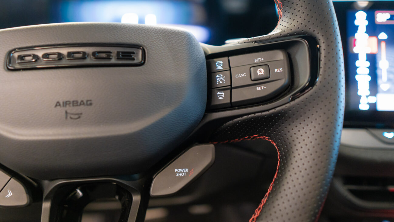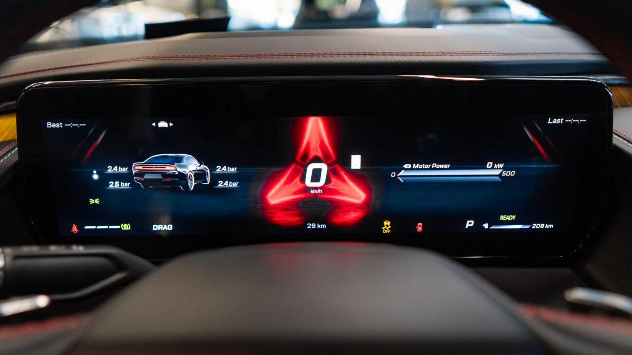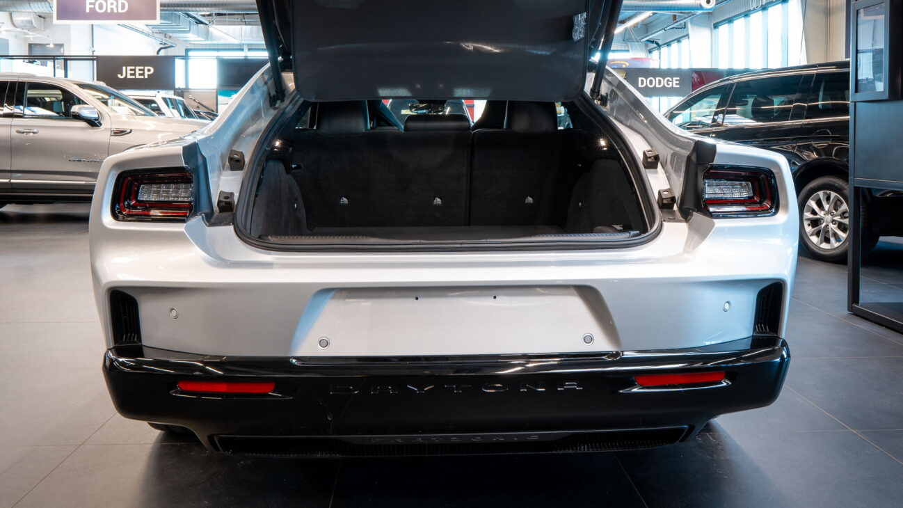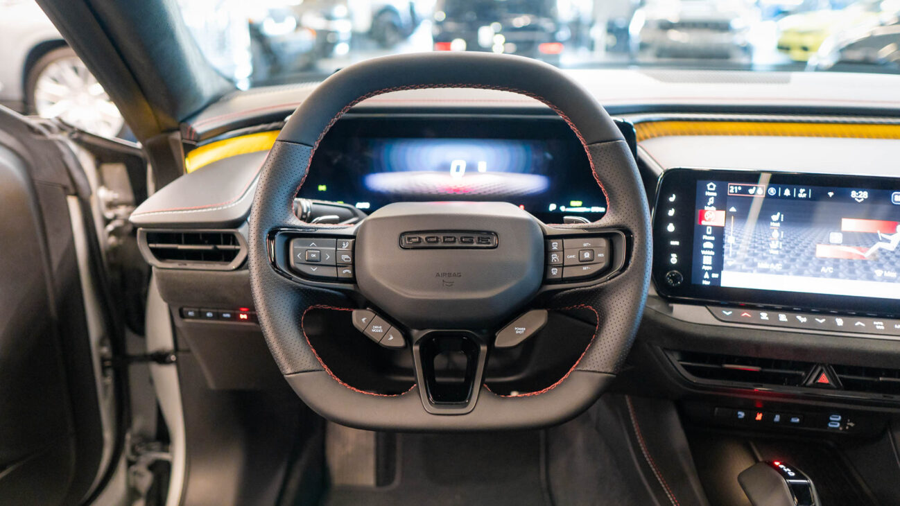 The Daytona Scat Pack channels its immense power through six-piston front and four-piston rear Brembo brakes with 406 mm rotors. The vehicle is also equipped with a regenerative braking system, which converts the car’s kinetic energy via the integrated generator back into electrical energy stored in the battery. Regeneration intensity, i.e., the degree of generator engagement during braking, can be instantly adjusted via steering wheel paddles across three levels: 0.1 g (lowest force and braking effect), 0.2 g (enhanced force and braking), and 0.3 g (maximum force and aggressive braking).