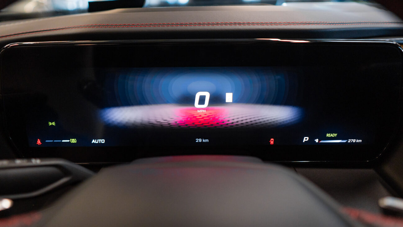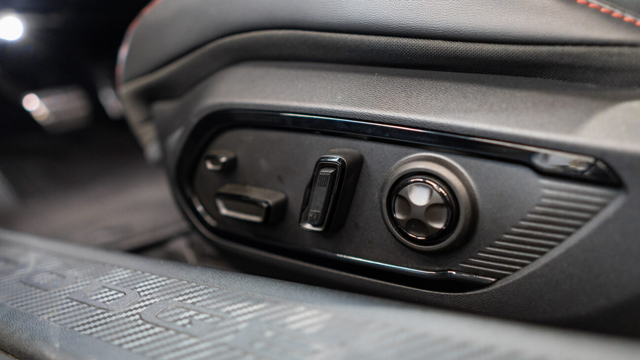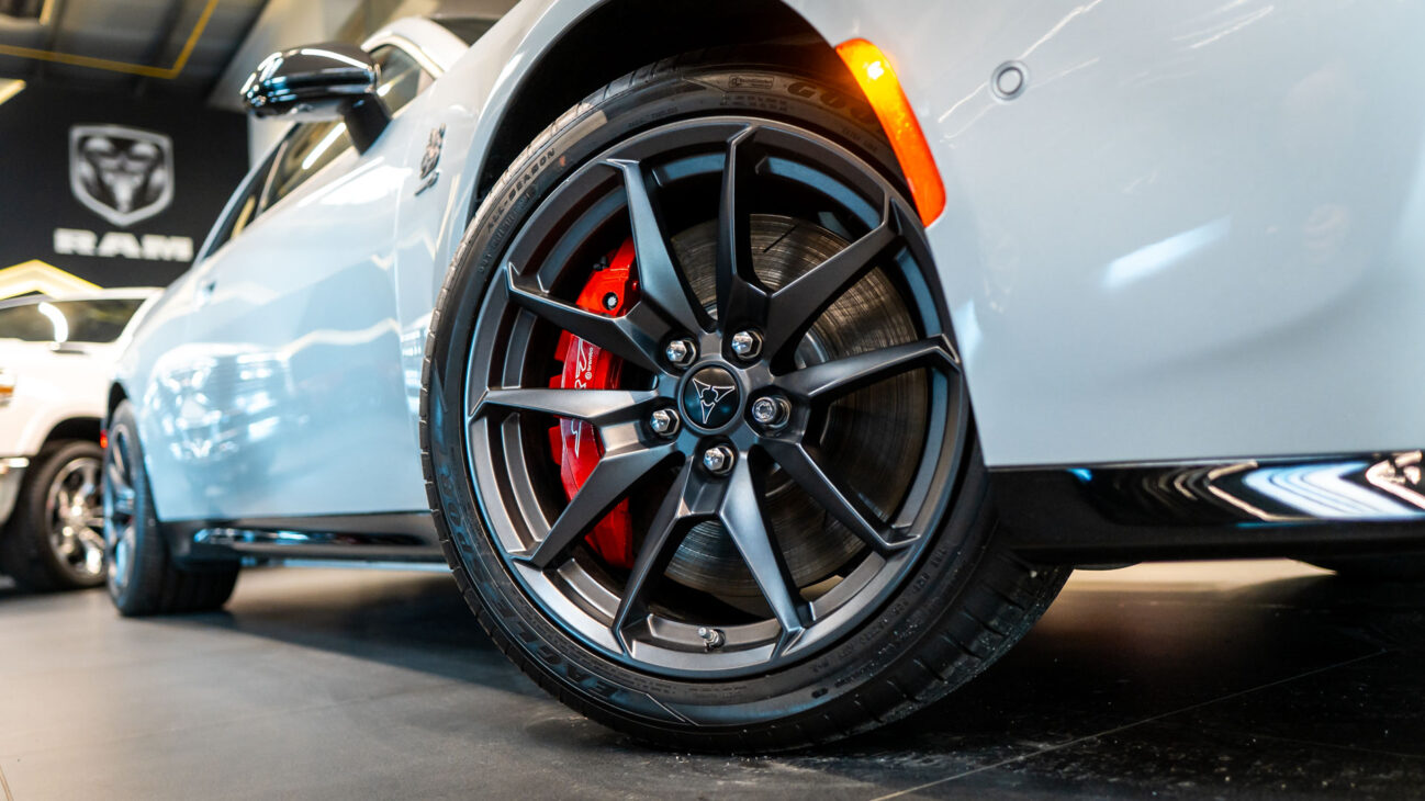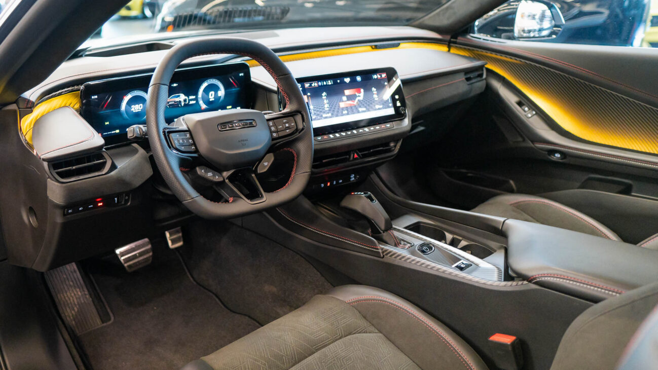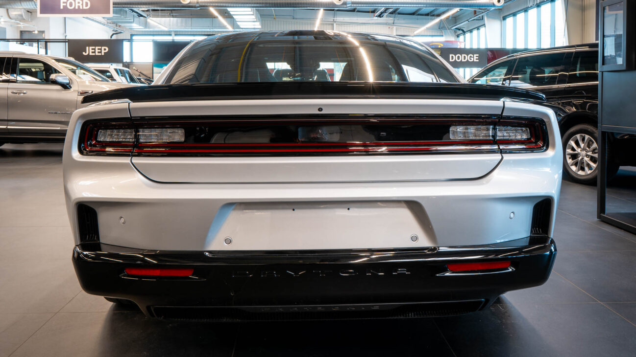 The Daytona Scat Pack channels its immense power through six-piston front and four-piston rear Brembo brakes with 406 mm rotors. The vehicle is also equipped with a regenerative braking system, which converts the car’s kinetic energy via the integrated generator back into electrical energy stored in the battery. Regeneration intensity, i.e., the degree of generator engagement during braking, can be instantly adjusted via steering wheel paddles across three levels: 0.1 g (lowest force and braking effect), 0.2 g (enhanced force and braking), and 0.3 g (maximum force and aggressive braking).