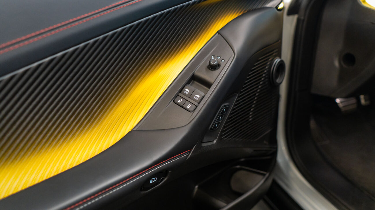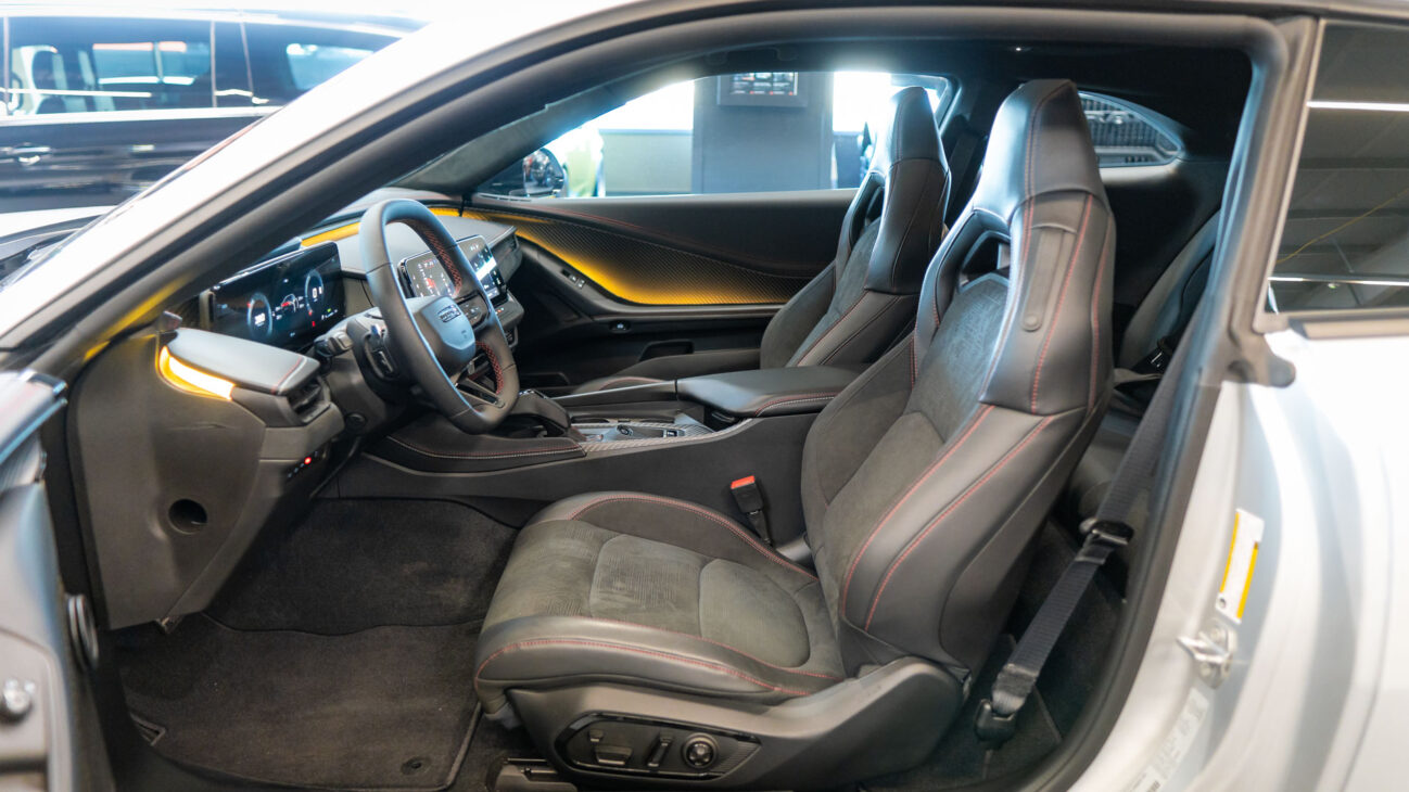 Carbon-fiber interior trim elements, door panels with carbon-fiber insert, instrument panel with carbon-fiber and suede wrap, full dark suede headliner. Sport seats with integrated headrest, leather/suede combination upholstery.