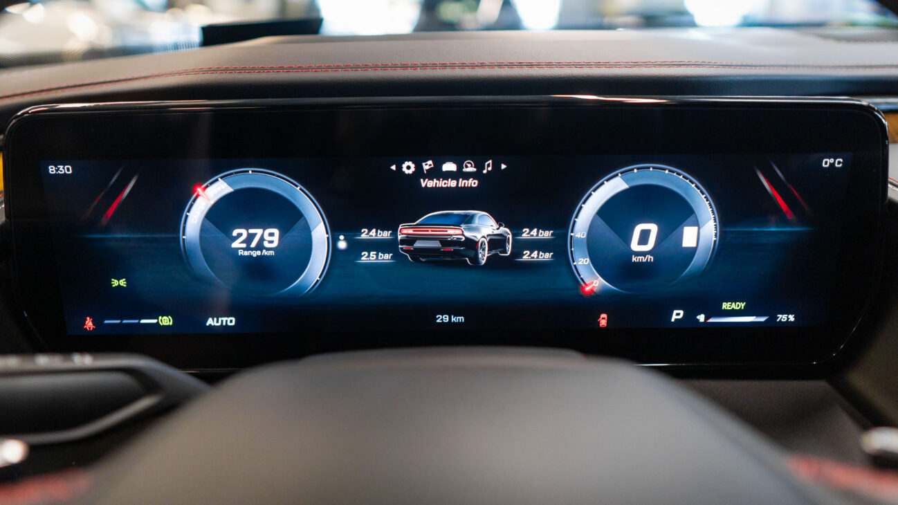 The Charger Daytona is built on a 400-volt architecture with a usable battery capacity of 93.9 kWh (100.5 kWh gross). Compared to European premium EVs, the Daytona offers an equal or slightly higher usable capacity. What truly stands out are its acceleration figures: 0–100 km/h in just 3.3 seconds (faster than Hellcat), 0–160 km/h in 8.0 seconds, and a quarter-mile in 11.5 seconds, already reaching 200 km/h at the line. Despite these impressive performance numbers, the vehicle still delivers a practical driving range of 387 km. The maximum DC fast-charging rate is 183 kW. With a sufficiently powerful charger, the battery can be replenished from 10 to 80% in 32 minutes. The standard 11 kW onboard charger, designed for home and private charging, naturally requires more time, with a full session taking around 6,8 hours.