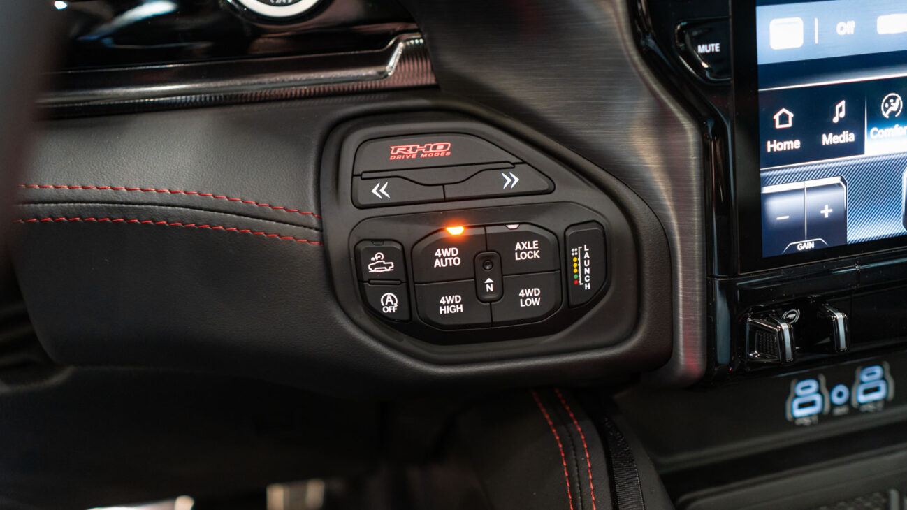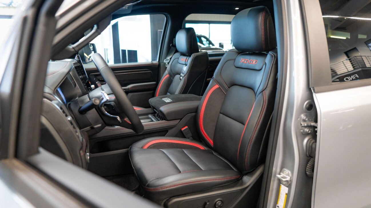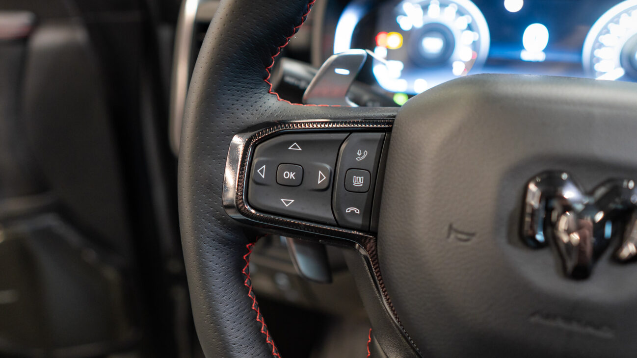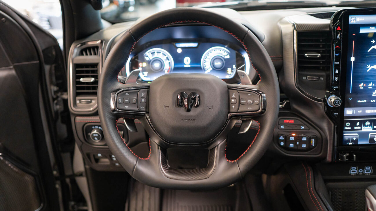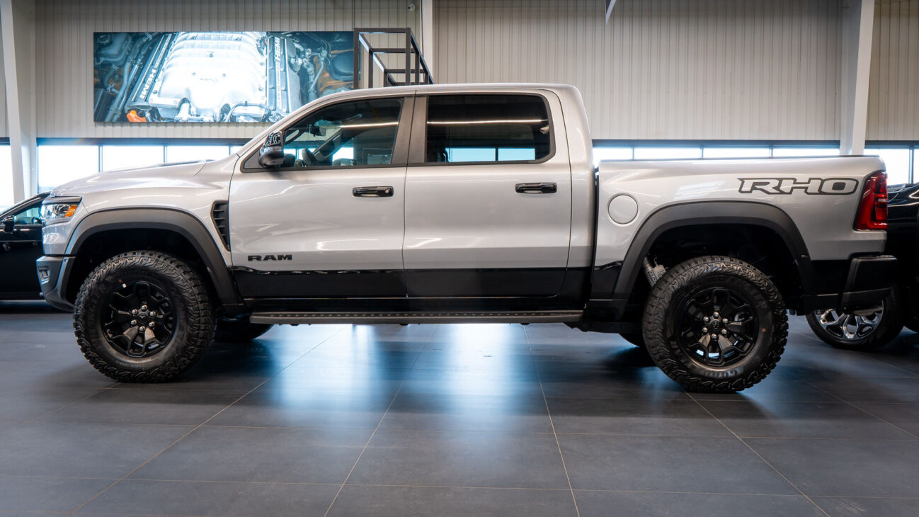 New RAM 1500 RHO. 3.0L I6 Hurricane HO Twin Turbo Engine power 540HP and 706 Nm of maximum torque. Stellar driving experience due to adaptive Bilstein Black Hawk shocks. Completely digital instrument cluster. Its functions are more readable and thus the interior is cleaner and modern. The Head-Up display also received an update with clearer appearance and expanded functionality. Full premium leather, racing inspired steering wheel with big paddle shifters. Drive modes, Launch Control, Performance pages and other track oriented features, the same found in top level Challengers. TRX marks a return of a traditional shift knob. 4WD drive, 18″ alloy wheels with 35″ offroad tires. Extreme offroad modes for Rock Crawl or extreme hill descent.