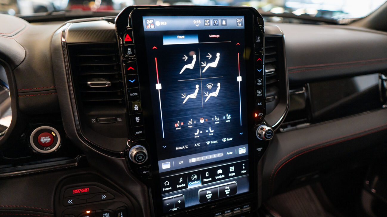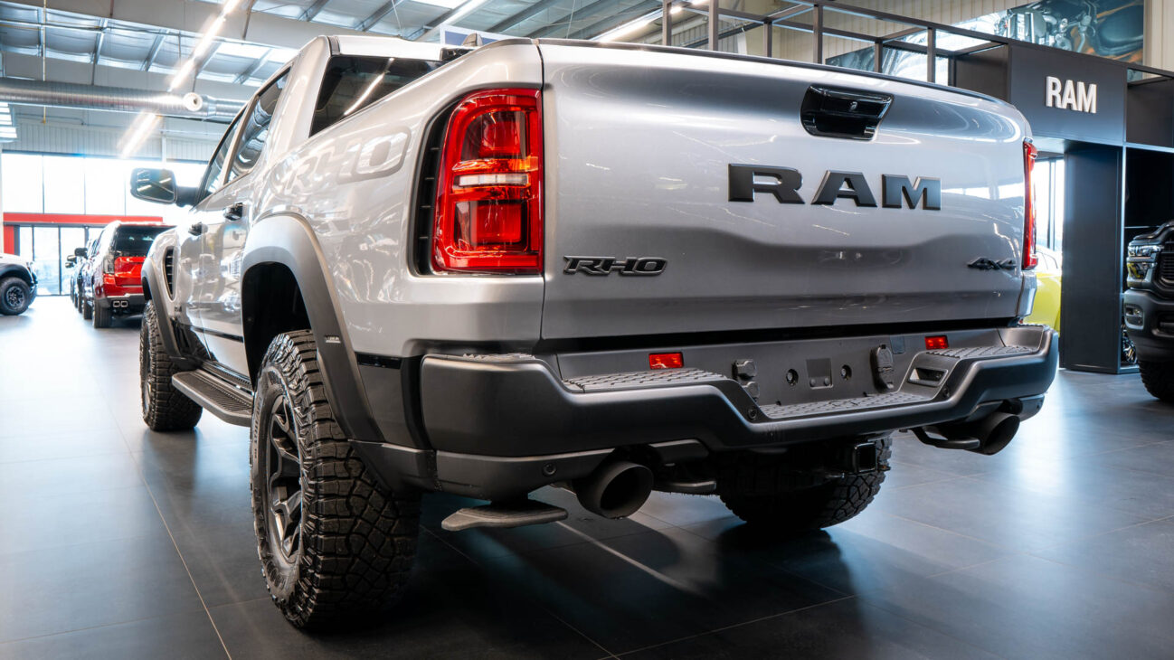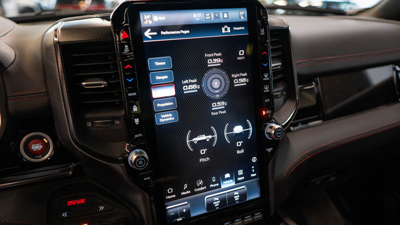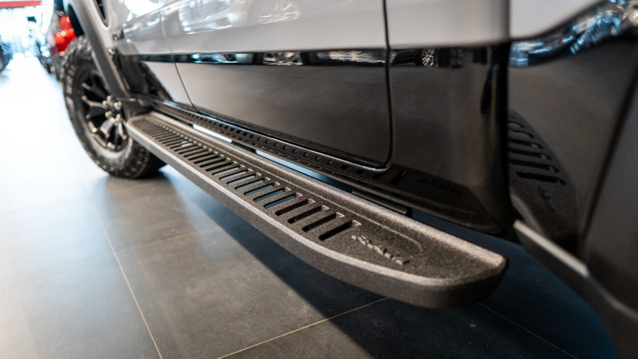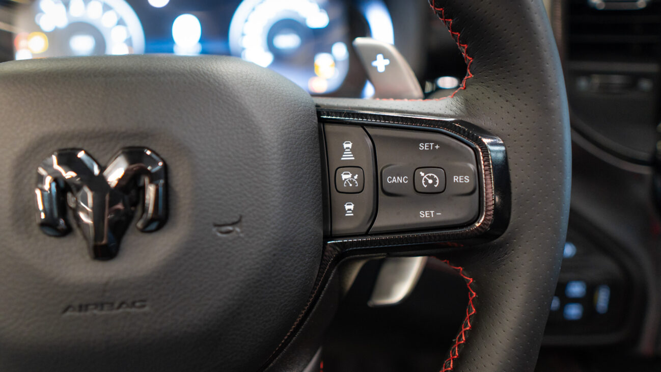 New RAM 1500 RHO. 3.0L I6 Hurricane HO Twin Turbo Engine power 540HP and 706 Nm of maximum torque. Stellar driving experience due to adaptive Bilstein Black Hawk shocks. Completely digital instrument cluster. Its functions are more readable and thus the interior is cleaner and modern. The Head-Up display also received an update with clearer appearance and expanded functionality. Full premium leather, racing inspired steering wheel with big paddle shifters. Drive modes, Launch Control, Performance pages and other track oriented features, the same found in top level Challengers. TRX marks a return of a traditional shift knob. 4WD drive, 18″ alloy wheels with 35″ offroad tires. Extreme offroad modes for Rock Crawl or extreme hill descent.