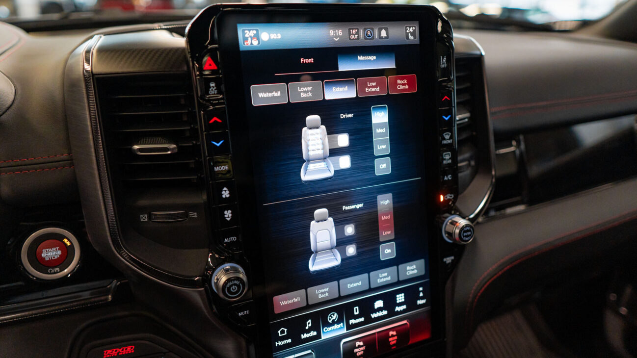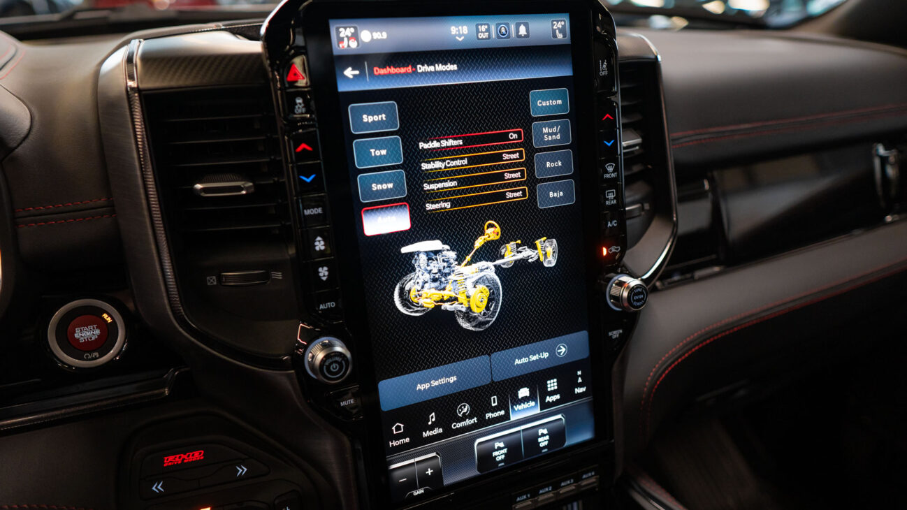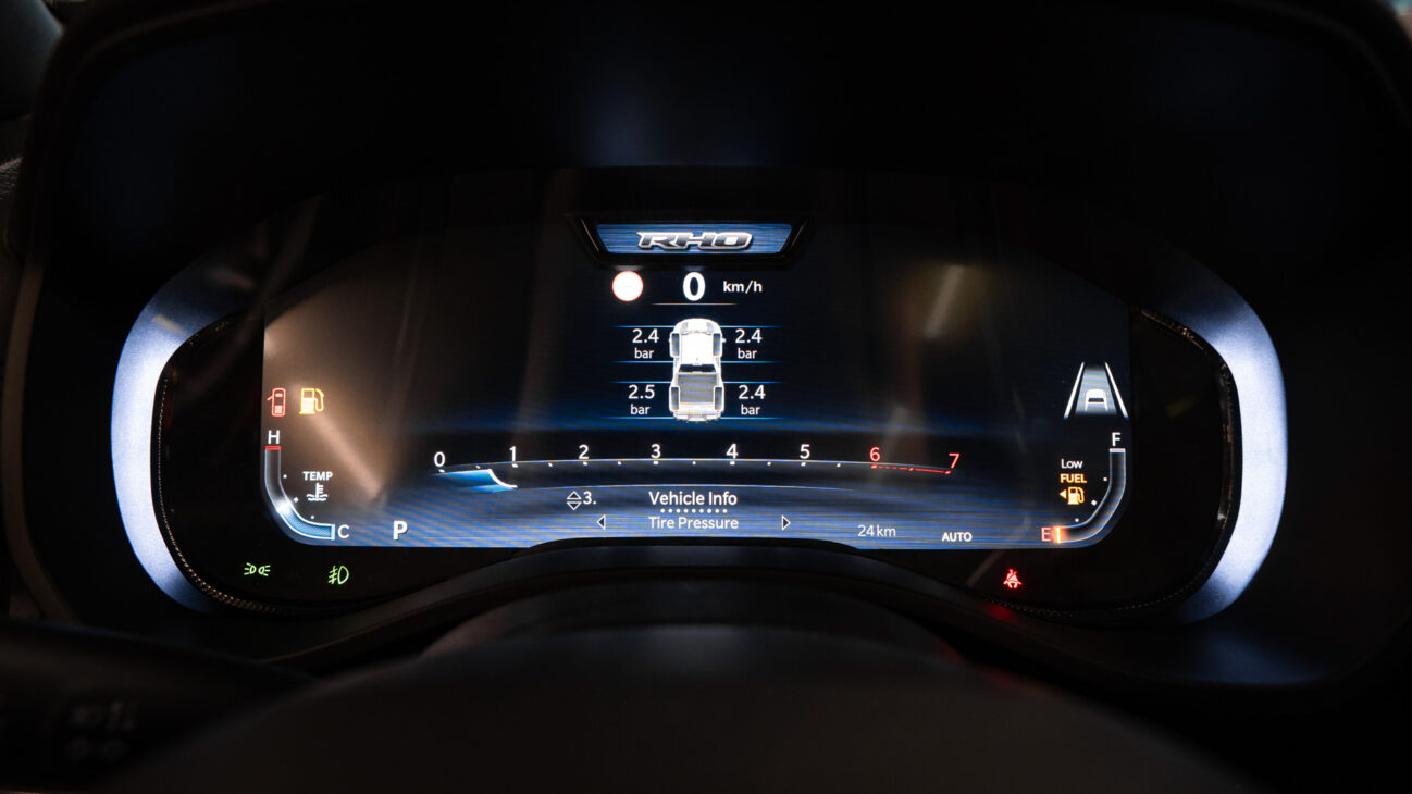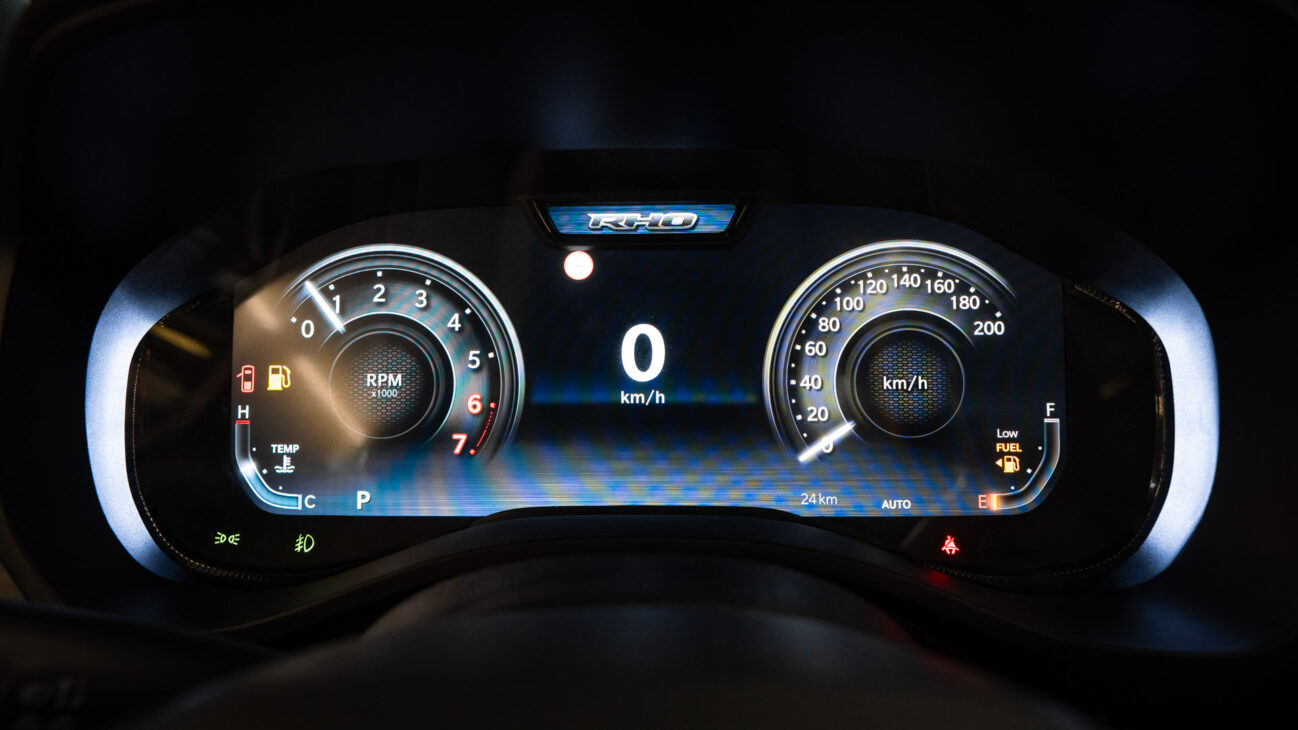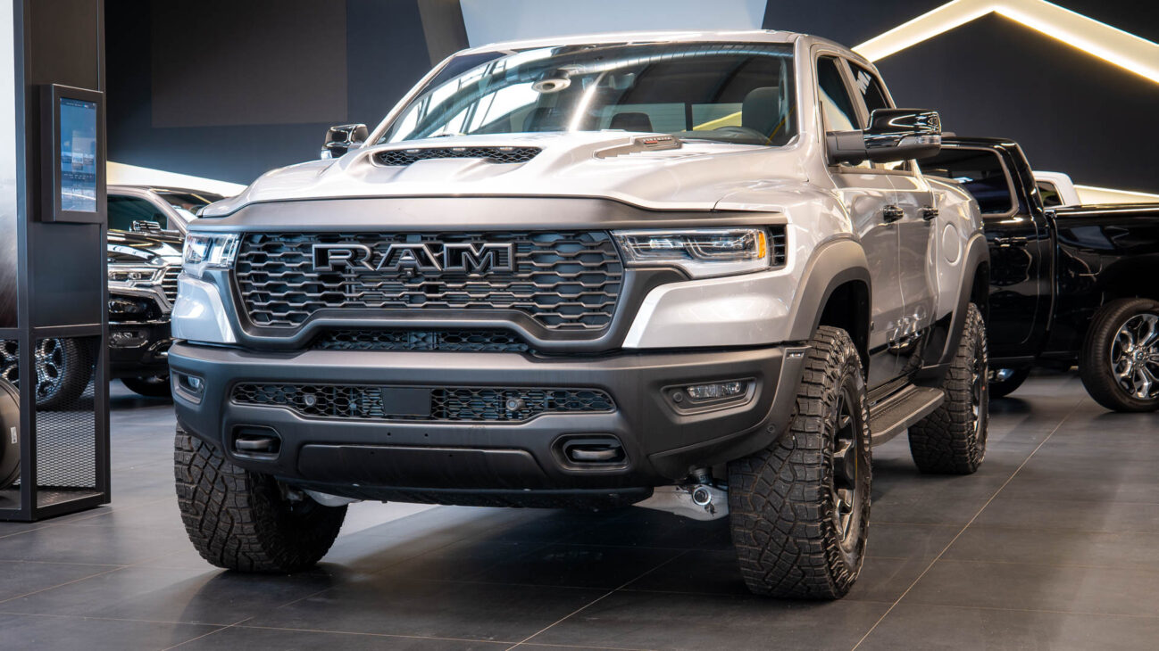 New RAM 1500 RHO. 3.0L I6 Hurricane HO Twin Turbo Engine power 540HP and 706 Nm of maximum torque. Stellar driving experience due to adaptive Bilstein Black Hawk shocks. Completely digital instrument cluster. Its functions are more readable and thus the interior is cleaner and modern. The Head-Up display also received an update with clearer appearance and expanded functionality. Full premium leather, racing inspired steering wheel with big paddle shifters. Drive modes, Launch Control, Performance pages and other track oriented features, the same found in top level Challengers. TRX marks a return of a traditional shift knob. 4WD drive, 18″ alloy wheels with 35″ offroad tires. Extreme offroad modes for Rock Crawl or extreme hill descent.