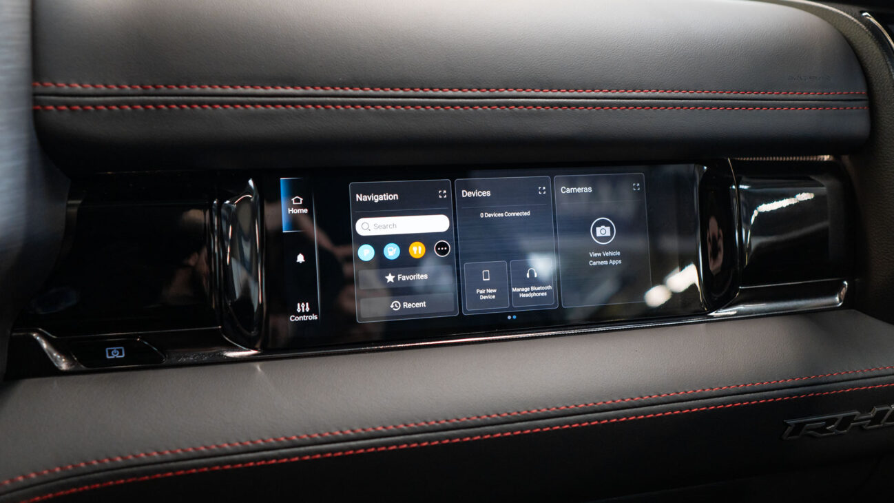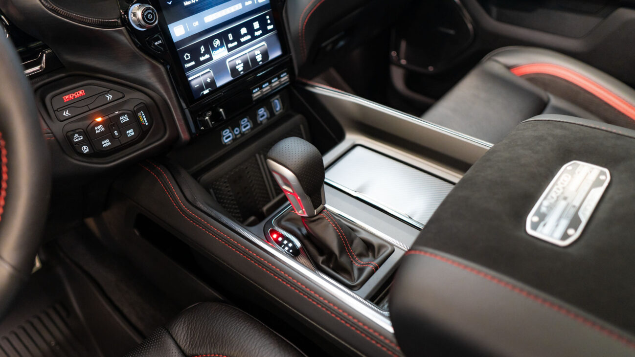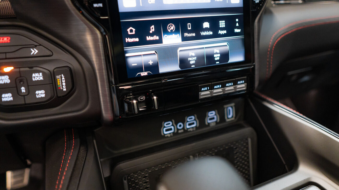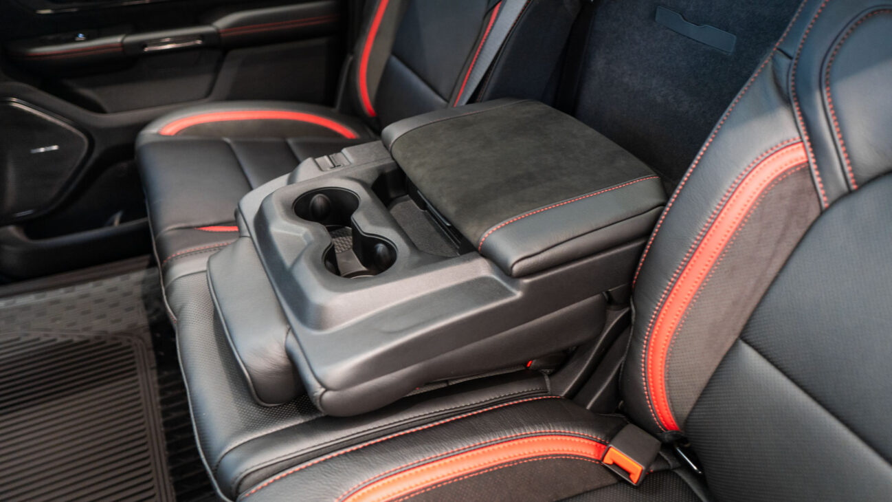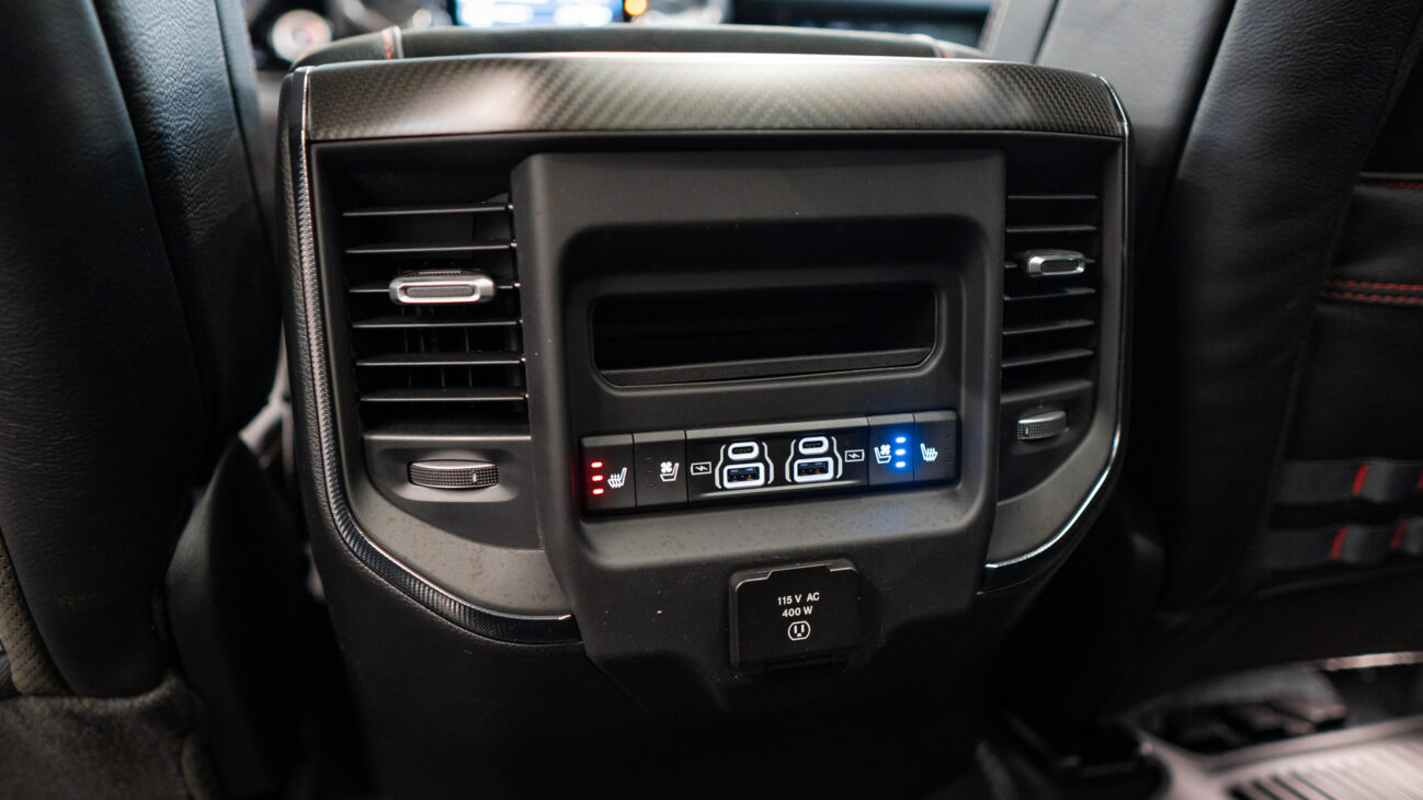 Despite TRX’s off-road nature its interior does not lack impressive luxury features. It features heated and ventilated seats in the front row covered in perforated leather and are power adjustable with memory including the bed rest. Leather multifunction steering wheel and is equipped with the usual controls like cruise control and many other features.One of the most unique steering wheel features are paddle shifters for manual gear change. Driver’s comfort is enhanced with additional features like power adjustable pedals, Head-up display and digiral rear mirror. Rear passengers have 4 USB ports (both full size and USB-C) in the center console alongside a full size power plug. There is plenty of storage under the rear seats and two lockable boxes in the floor. Entry is made easy with the integrated side steps that are essential given the truck’s impressive ground clearance.