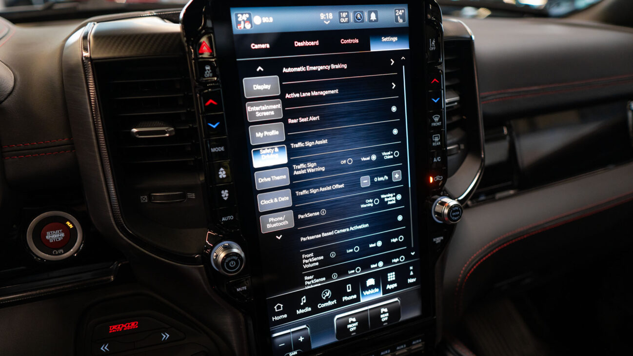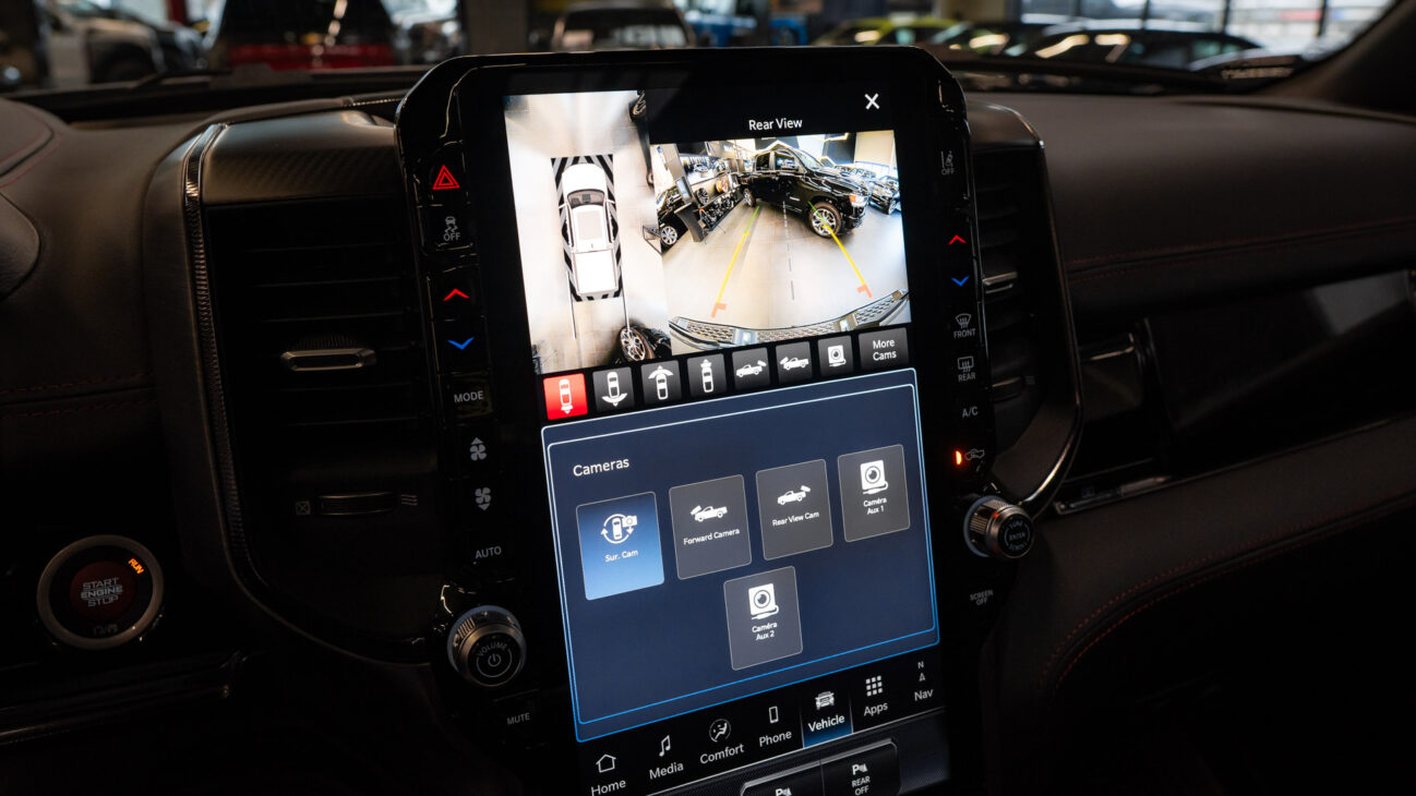 New UConnect 5 Nav infotainment system with huge 12″ screen provides control over all the vehicle’s functions though Power Wagon still keeps the most important comfort features as physical buttons like climate control, radio volume and others. UConnect 5 of course supports both Apple CarPlay and Android Auto. 360 degree surround view parking camera displays everything around the vehicle on the big 12″ screen for maximum precision and supports specific camera zooms and views for the side and rear cameras to make tricky parking and trailer backup maneuvers easy. Premium Harman/Kardon sound system provies high quality audio thanks to 18 speakers, subwoofer and 900W amplifier. This audio system features Logic 7 Surround Sound technology – Music is converted into a surround sound experience, providing rich, captivating sound that reaches every corner.