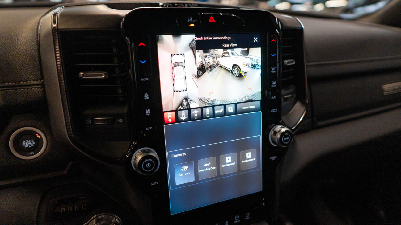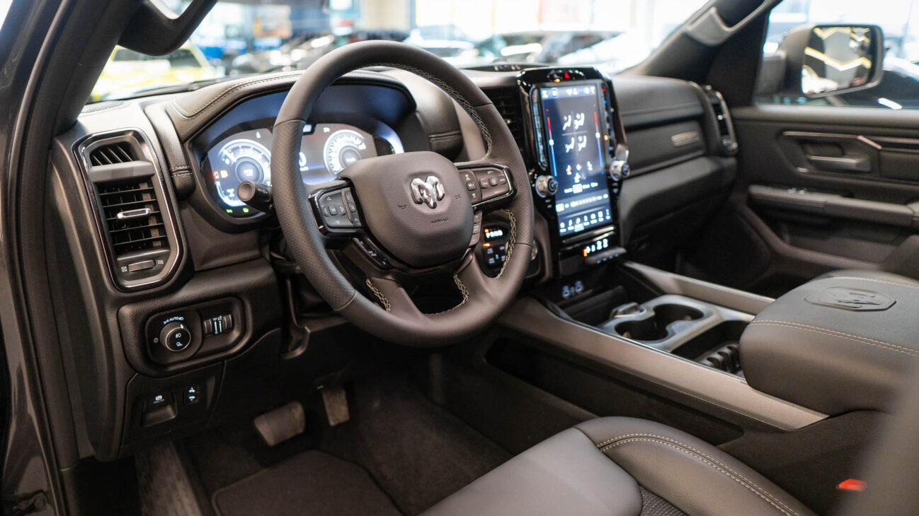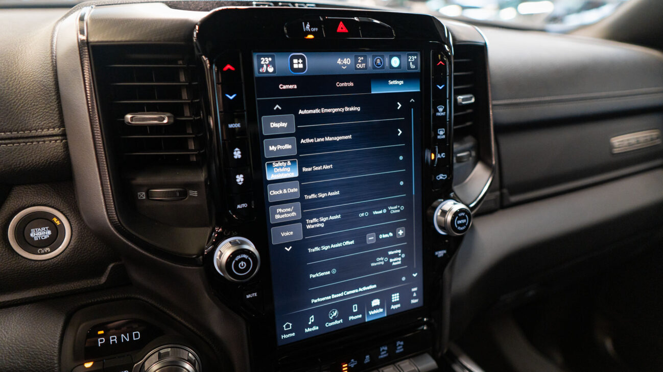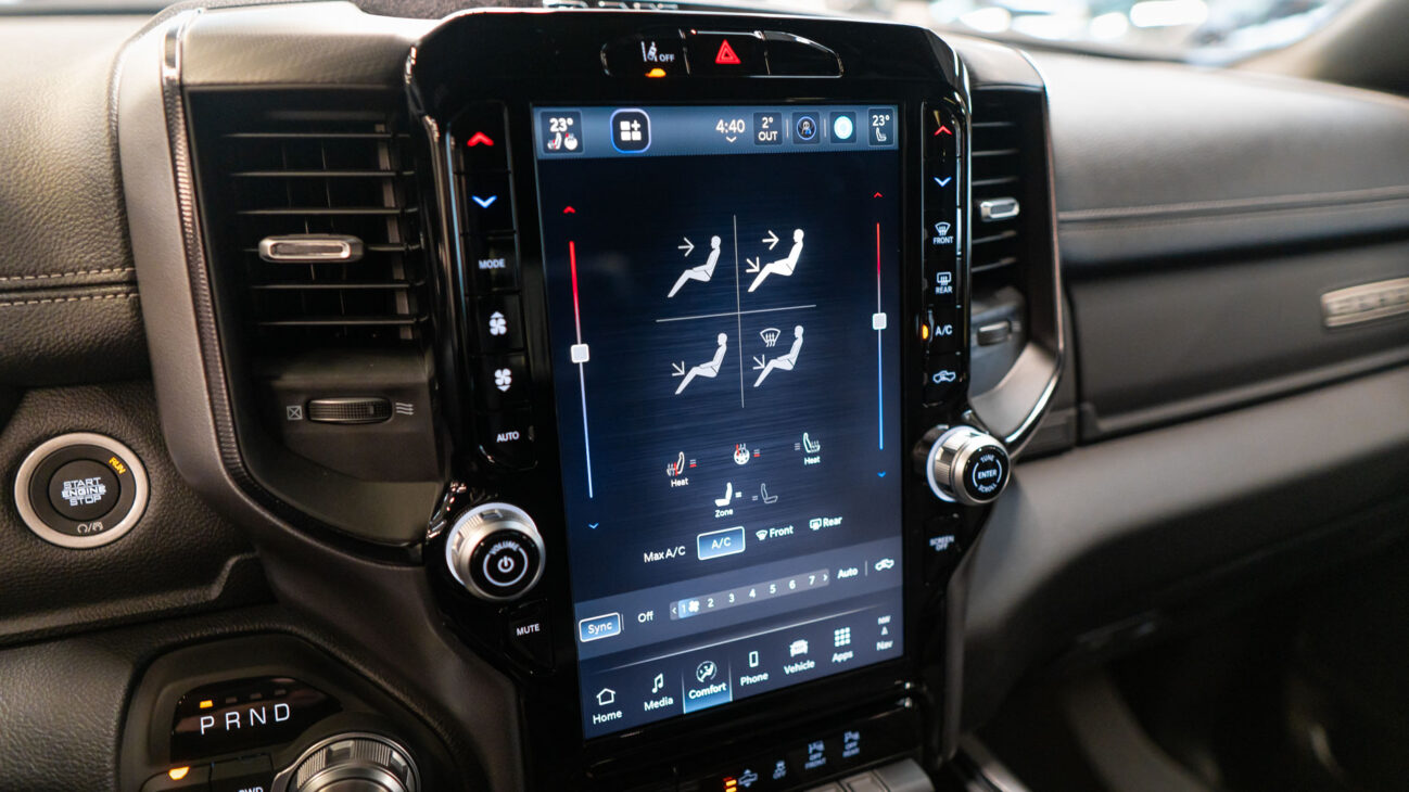UConnect 5 Nav infotainment system with huge 12″ screen provides control over all the vehicle’s functions though RAM still keeps the most important comfort features as physical buttons like climate control, radio volume and others. UConnect 5 of course supports both Apple CarPlay and Android Auto.