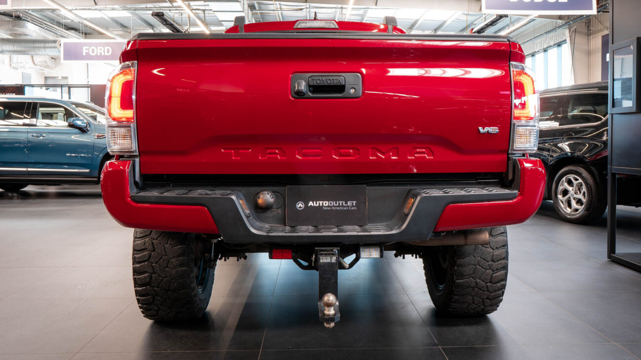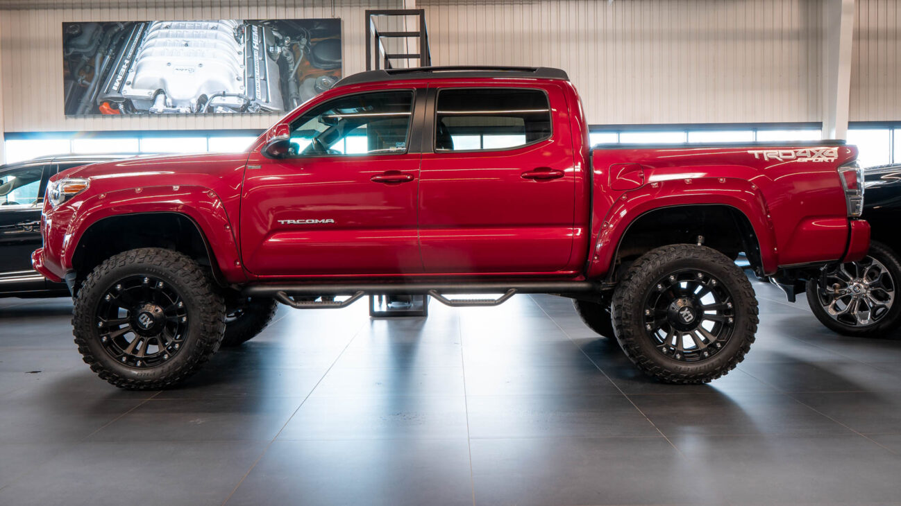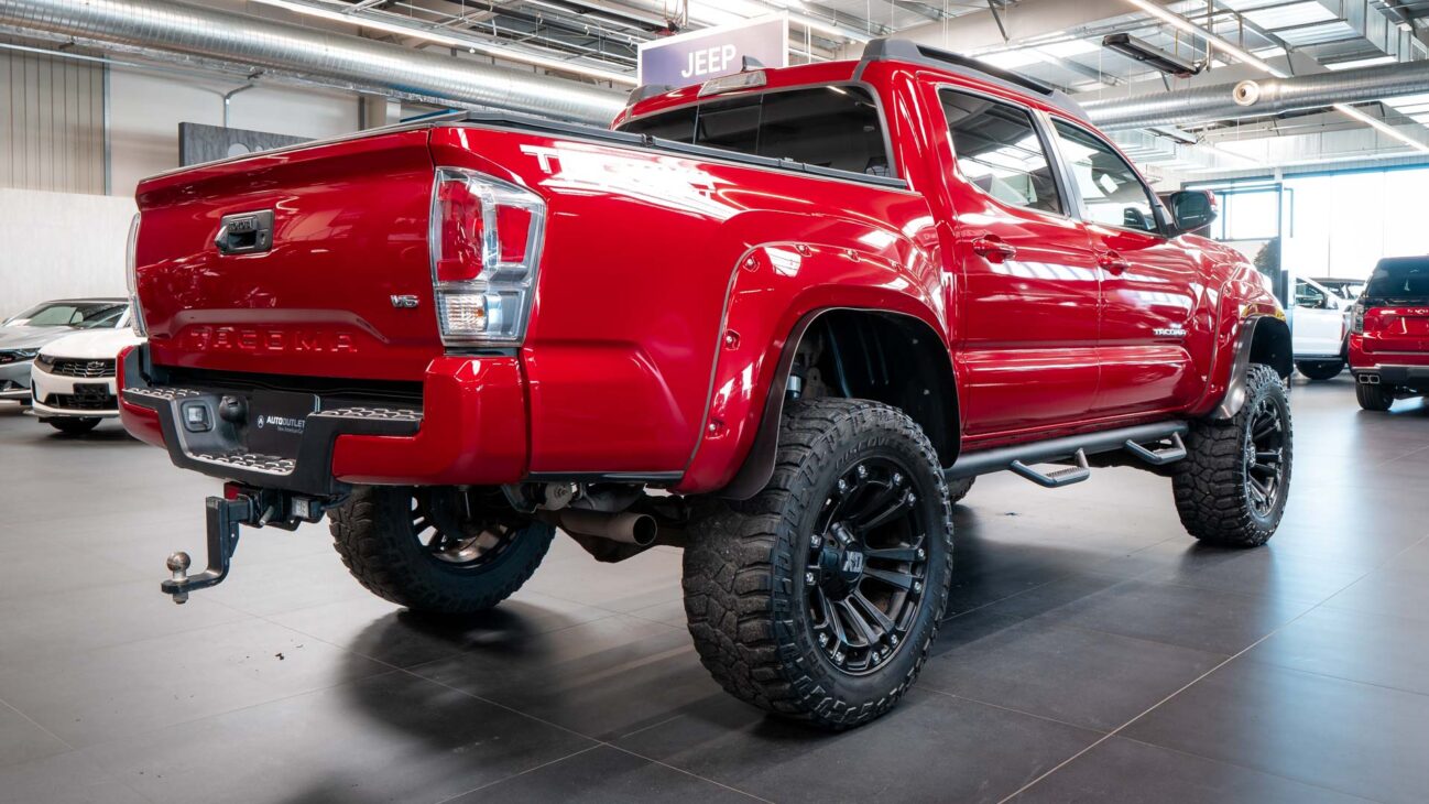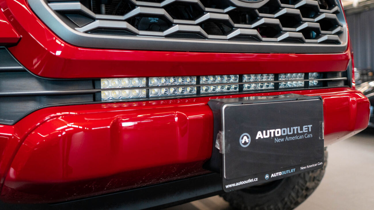 Toyota Tacoma in Special Edition 4×4. This Auto Outlet Design custom build has been lifted with a renoved brand BDS LIFT KIT 6“. The design of the car is also emphasized by the luxury aluminium rims KMC XD851 Monster 3 20×10″, offroad tires 35″ R20 Cooper Discover, which are covered by body painted fender flares Bushwacker. Extra powerful lighting is provided by big LED reflector with 30″ size behind the front bumper with total power output 180W. Vehicle entry is made easy with bulky side steps.