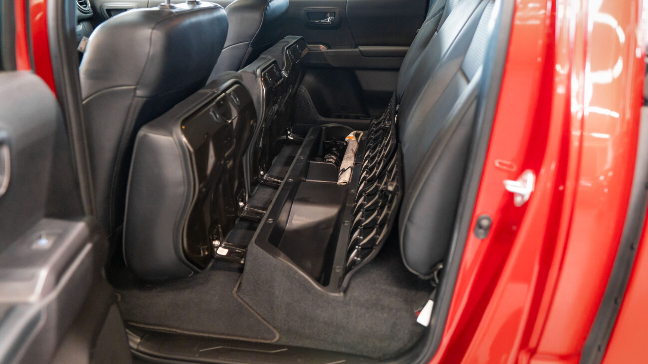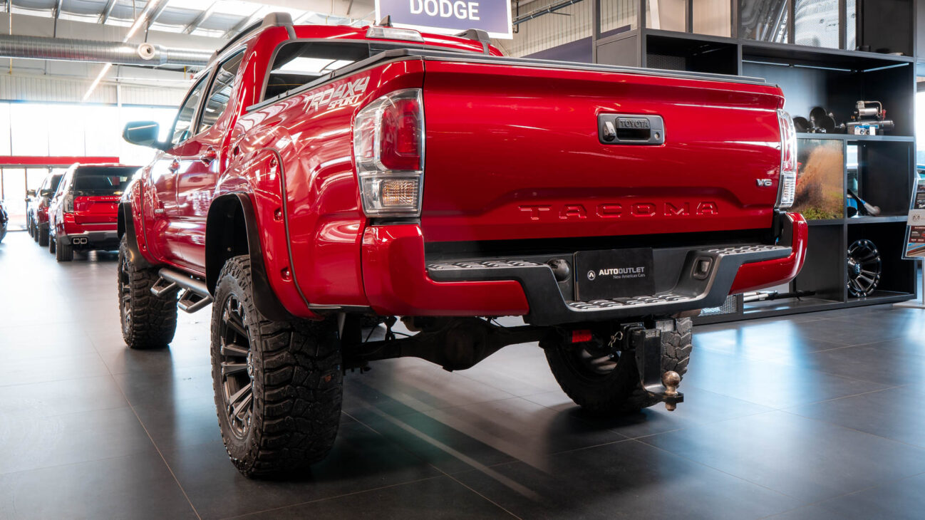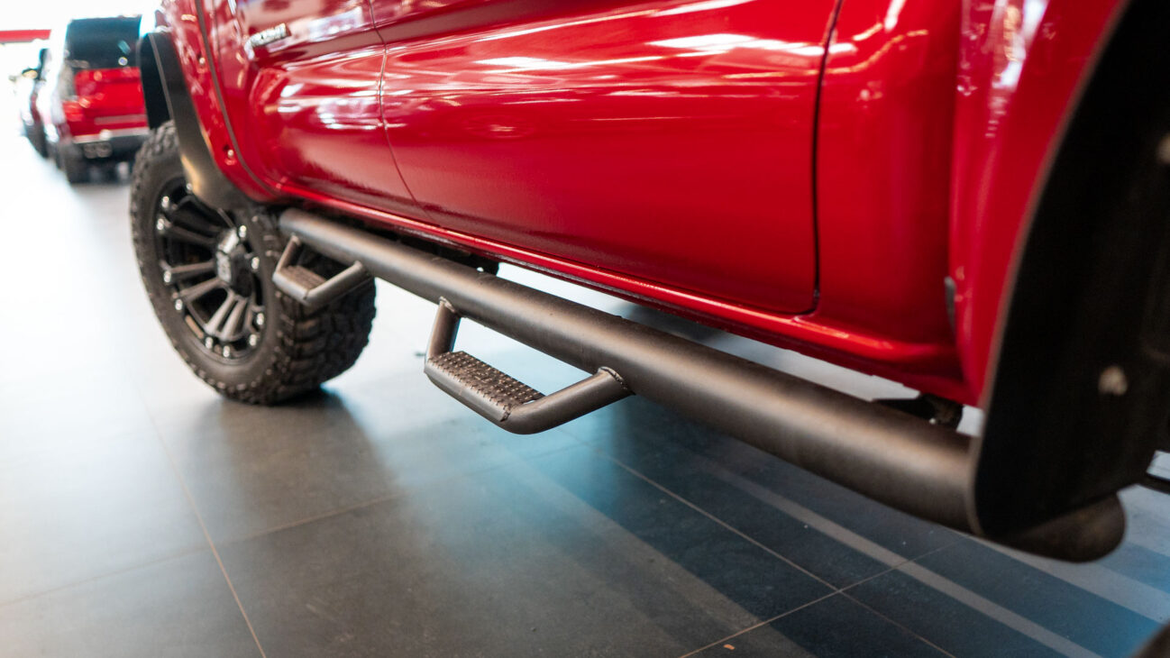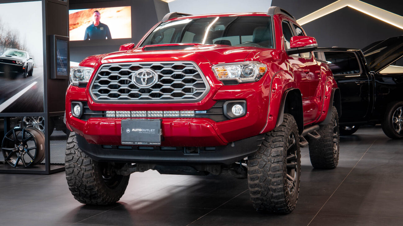 Toyota Tacoma in Special Edition 4×4. This Auto Outlet Design custom build has been lifted with a renoved brand BDS LIFT KIT 6“. The design of the car is also emphasized by the luxury aluminium rims KMC XD851 Monster 3 20×10″, offroad tires 35″ R20 Cooper Discover, which are covered by body painted fender flares Bushwacker. Extra powerful lighting is provided by big LED reflector with 30″ size behind the front bumper with total power output 180W. Vehicle entry is made easy with bulky side steps.