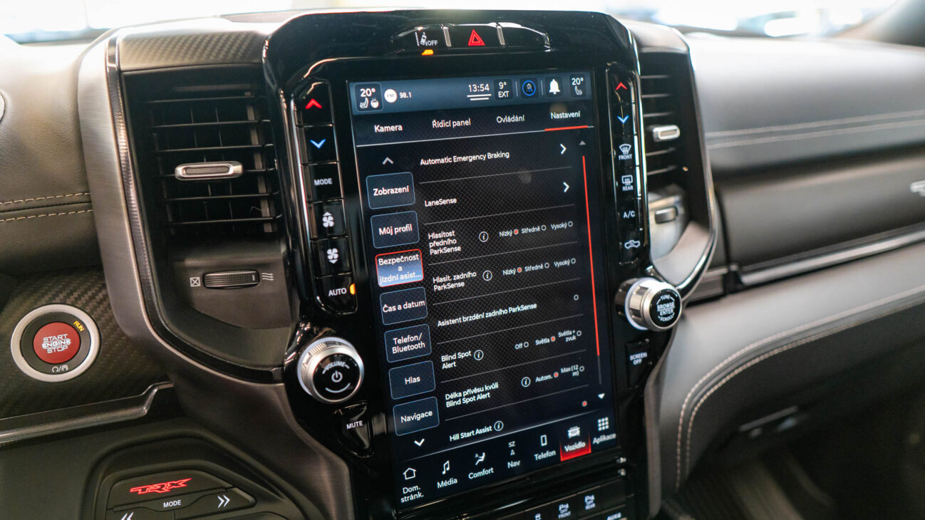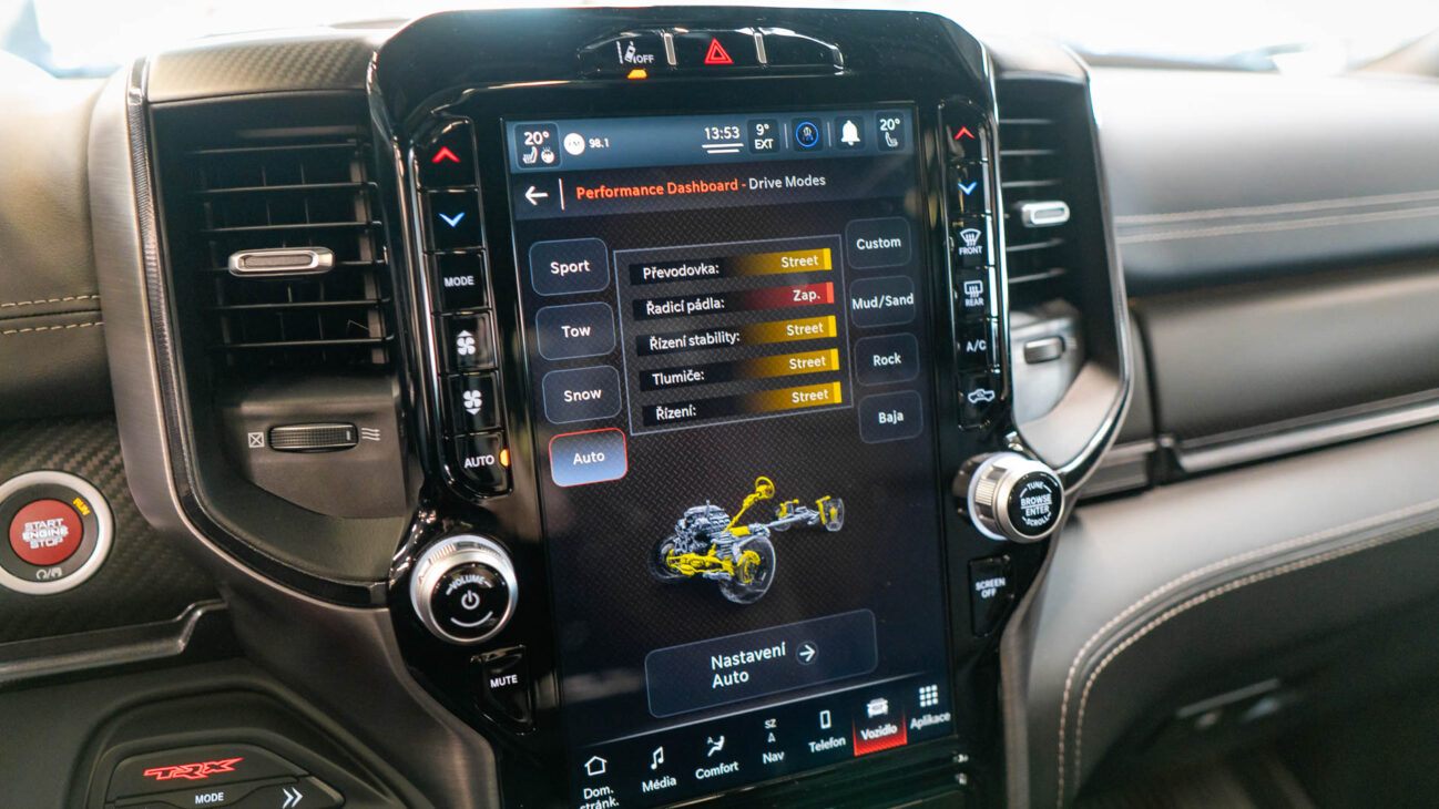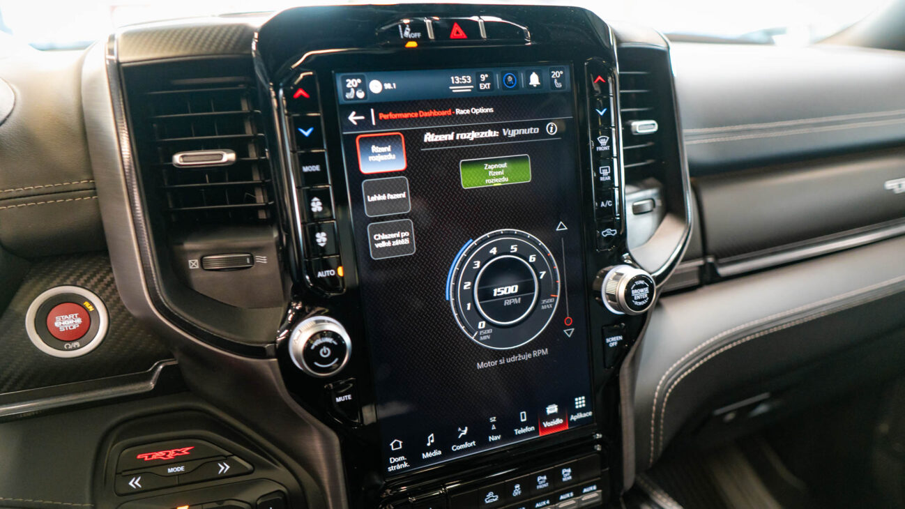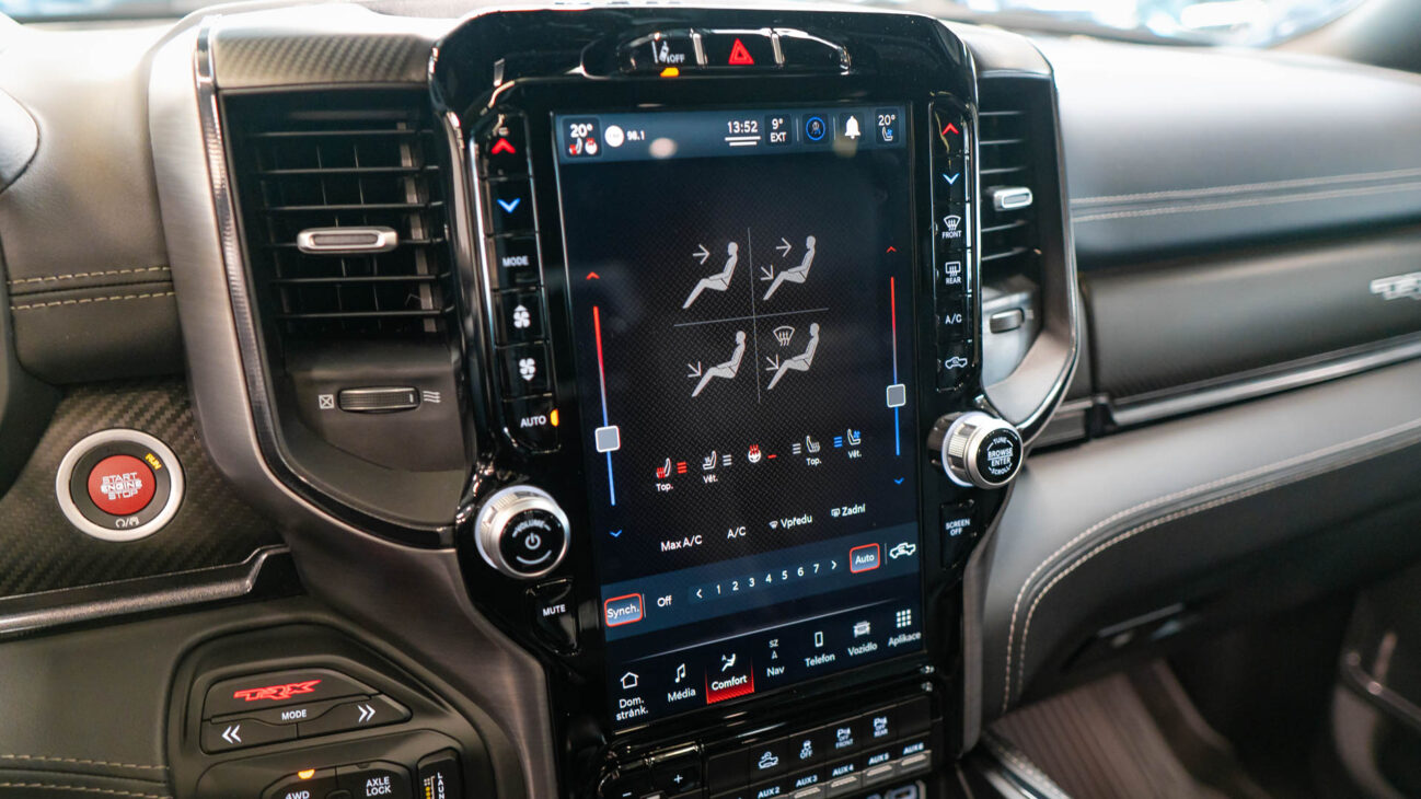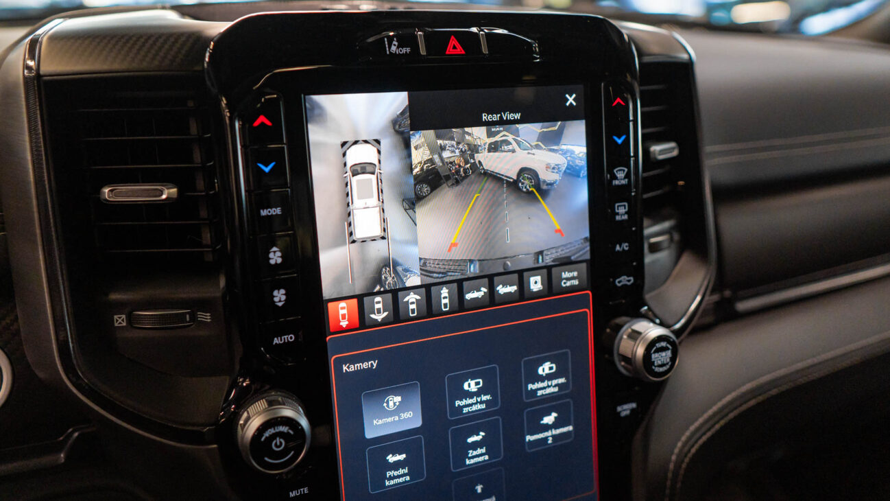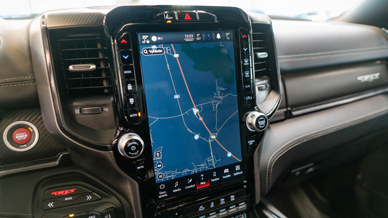 Nový infotainment UConnect 5 Nav s 12″ displejem nabízí kontrolu nad veškerými funkcemi vozidla, přesto si ale RAM zachovává fyzická tlačítka pro ovládání nejdůležitějších komfortních funkcí za jízdy jako klimatizace, hlasitosti rádia a další. UConnect 5 samozřejmě podporuje Apple CarPlay i Android Auto. 360 stupňová parkovací kamera na velkém displeji zobrazuje dění kolem vozu ve velkém detailu, navíc nabízí možnost přiblížení bočních a zadních kamer pro usnadnění pakovacích manévrů nebo pro přesné nacouvání k přívěsu. Prémiový Harman/Kardon audiosystém poskytuje kvalitní a vyvážené zvukové podání v celé kabině vozu díky 18 reproduktorům, subwooferu a zesilovači o výkonu 900W. Funkce Logic 7 u tohoto audio systému zajišťuje perfektní 360° prostorový zvuk.