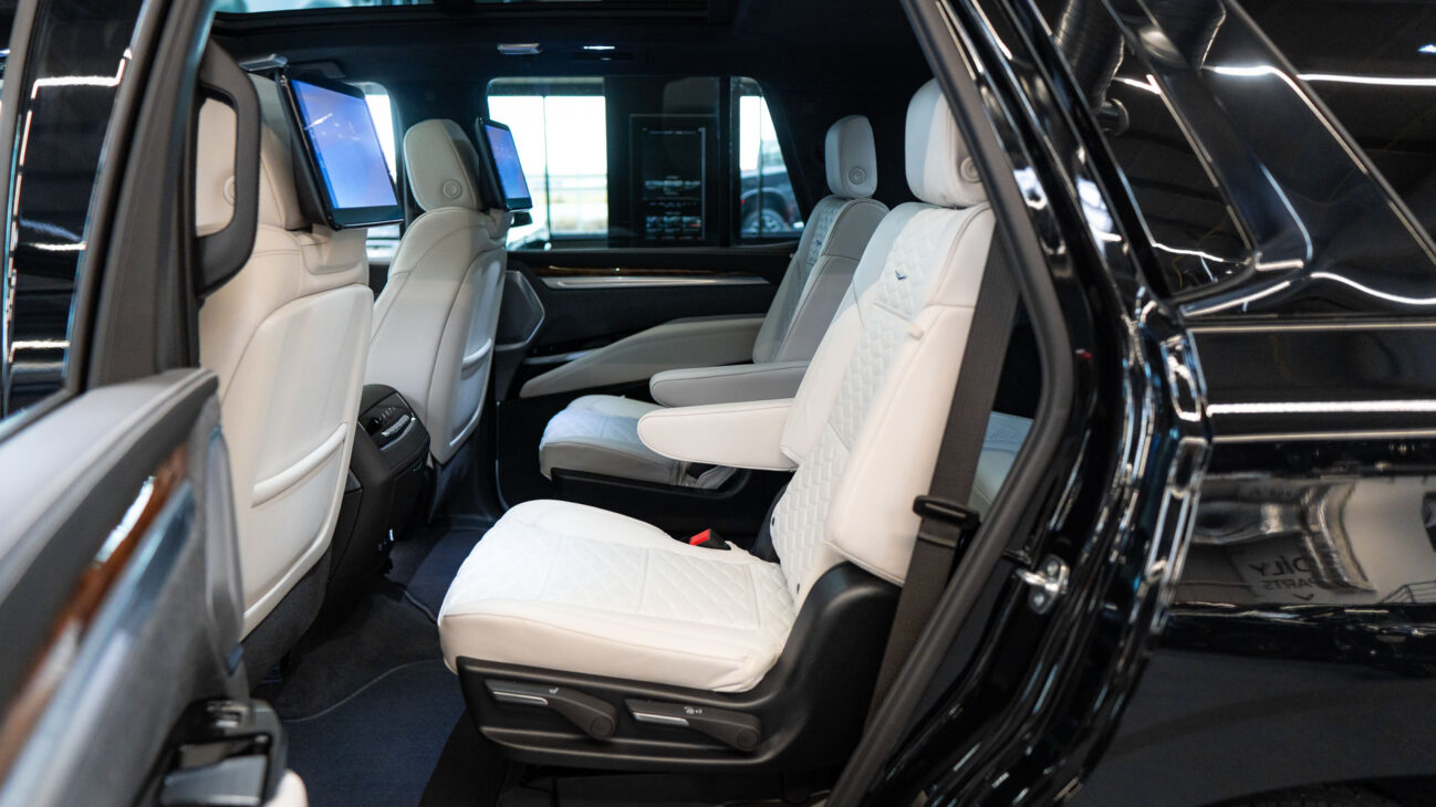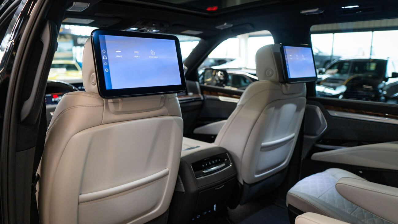 Neuvěřitelný audio systém s 36 reproduktory a 3D zvukem zajistila firma AKG, specializující se na profesionální zvukovou techniku, používanou v nahrávacích studiích. Celý audio systém obsahuje navíc 3 zesilovače s předním a zadním subwooferem. 3D zvuk je obohacen reproduktory v stropu a opěrkách hlavy a novým digitálním High-Res zpracováním. Ovládání hlasitosti u spolujezdce na přední sedačce umožňuje nastavit hlasitost audiosystému nezávisle od ostatních sedadel. Pokyny navigace a upozornění přicházejí ze stran kam Vás navádí navigace. Pokud zatáčíte vlevo ozývají se pokyny z levých reproduktorů a naopak při odbočování vpravo se ozývají z pravých reproduktorů. Hlasitost výzvy se zvyšuje, čím je vůz blíže k odbočce, což řidiči usnadňuje sledování pokynů. Funkce Conversation Enhancement usnadňuje posádce komunikaci ve vozidle. Systém promítá do reproduktorů hlas z přední sedačky na zadní a naopak hlasy ze zadních řad do předních řad. Zadní multimediální systém obsahuje dvě 12,6″ HD LCD dotykové obrazovky s HDMI/USB vstupy a možností bezdrátové projekce z mobilních zařízení. Součástí systému jsou dva páry kvalitních Cadillac bezdrátových sluchátek. Air Ionizer – filtrace vzduchu v interiéru.
