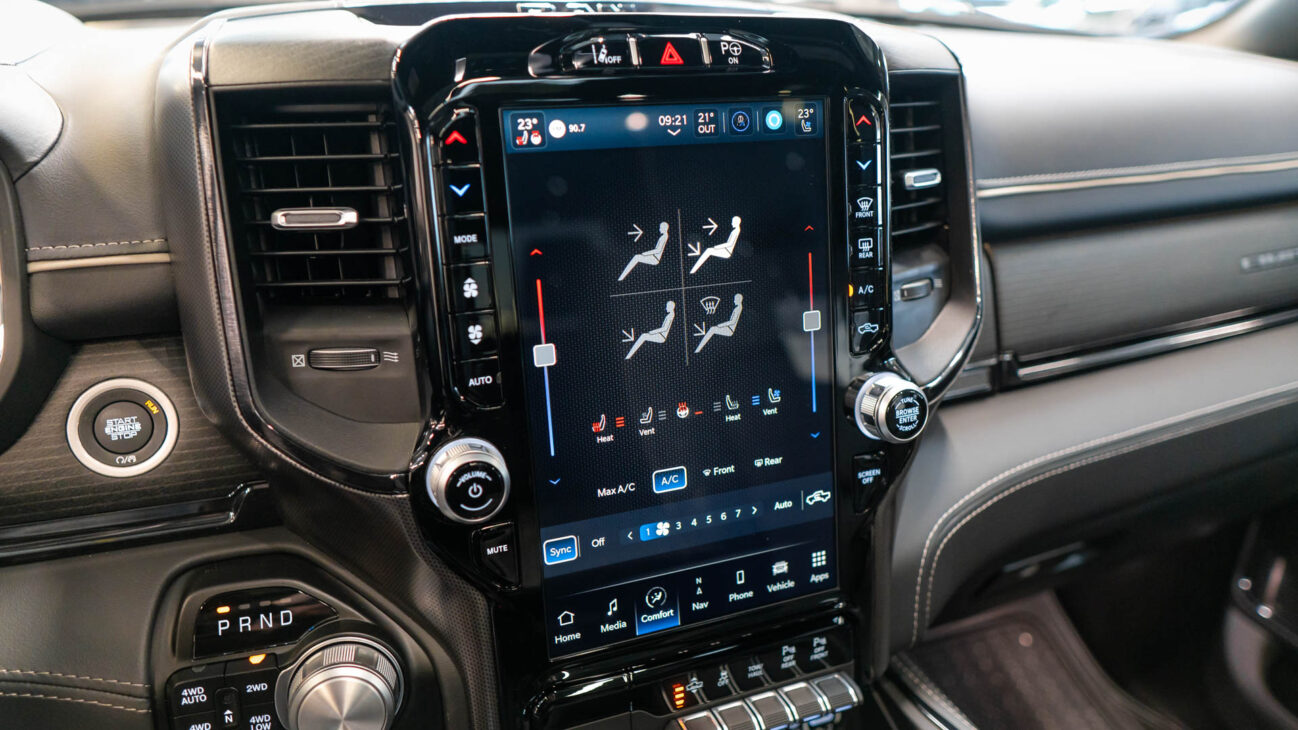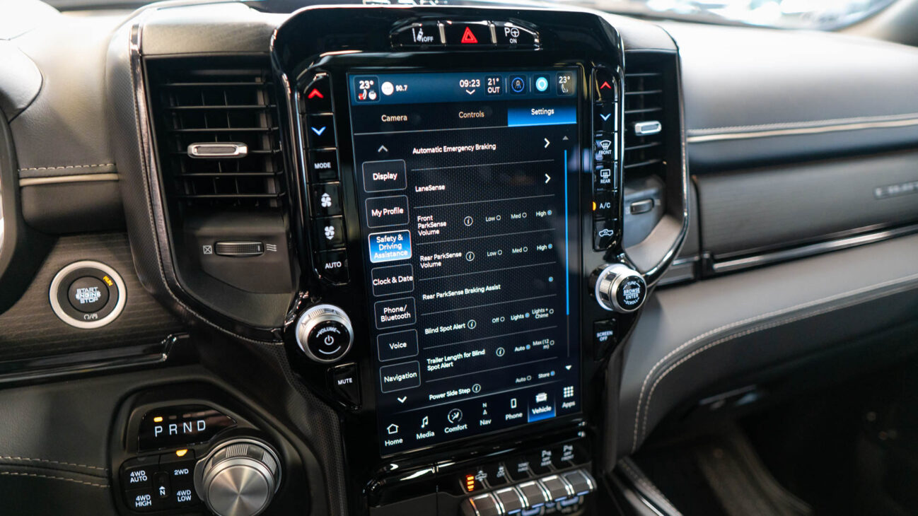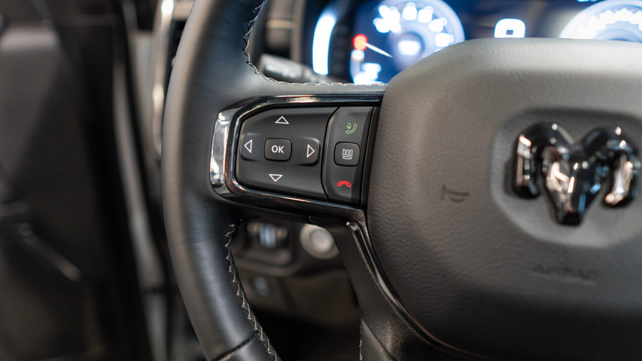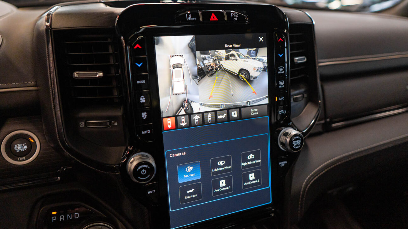 Nový infotainment UConnect 5 Nav s 12″ displejem nabízí kontrolu nad veškerými funkcemi vozidla, přesto si ale RAM zachovává fyzická tlačítka pro ovládání nejdůležitějších komfortních funkcí za jízdy jako klimatizace, hlasitosti rádia a další. UConnect 5 samozřejmě podporuje Apple CarPlay i Android Auto. 360 stupňová parkovací kamera na velkém displeji zobrazuje dění kolem vozu ve velkém detailu, navíc nabízí možnost přiblížení bočních a zadních kamer pro usnadnění pakovacích manévrů nebo pro přesné nacouvání k přívěsu. Prémiový Harman/Kardon audiosystém poskytuje kvalitní a vyvážené zvukové podání v celé kabině vozu díky 18 reproduktorům, subwooferu a zesilovači o výkonu 900W. Funkce Logic 7 u tohoto audio systému zajišťuje perfektní 360° prostorový zvuk.