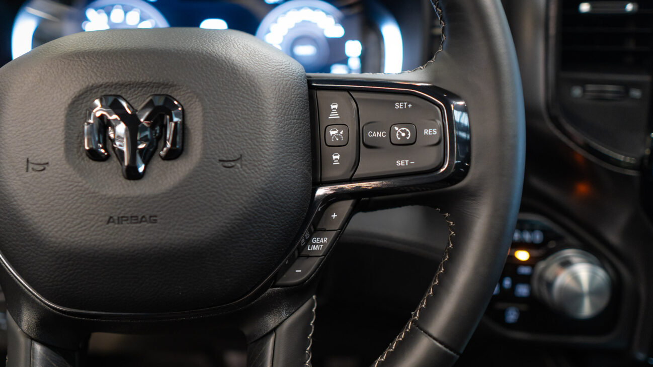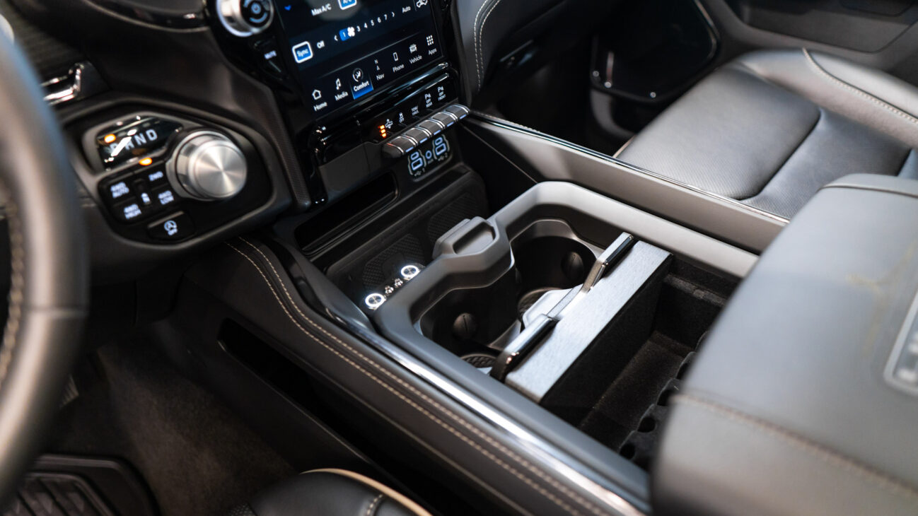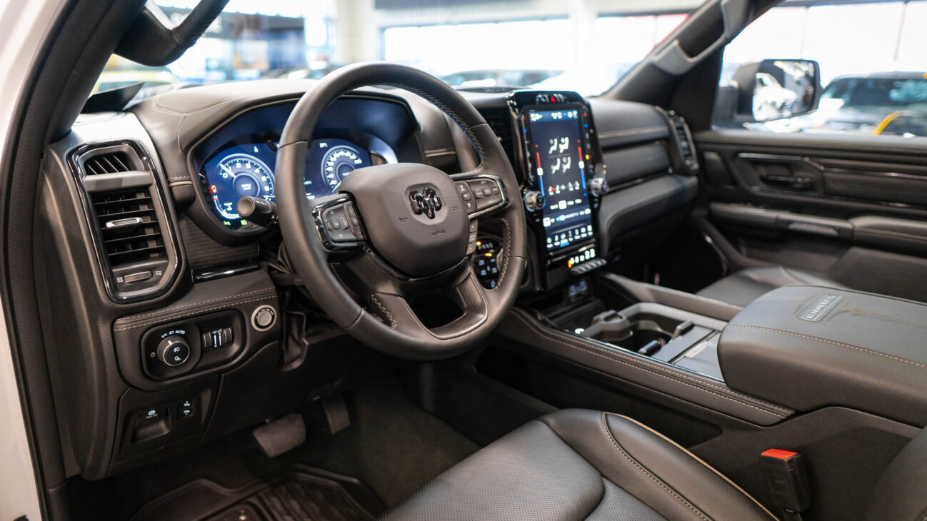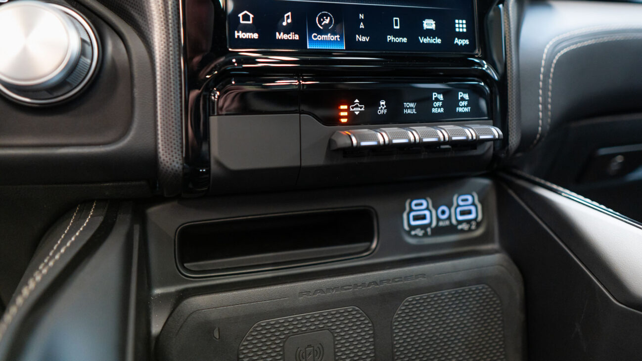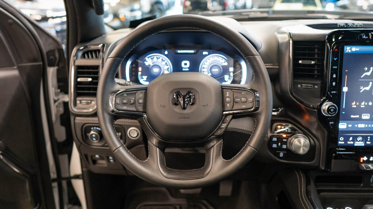 Nový infotainment UConnect 5 Nav s 12″ displejem nabízí kontrolu nad veškerými funkcemi vozidla, přesto si ale RAM zachovává fyzická tlačítka pro ovládání nejdůležitějších komfortních funkcí za jízdy jako klimatizace, hlasitosti rádia a další. UConnect 5 samozřejmě podporuje Apple CarPlay i Android Auto. 360 stupňová parkovací kamera na velkém displeji zobrazuje dění kolem vozu ve velkém detailu, navíc nabízí možnost přiblížení bočních a zadních kamer pro usnadnění pakovacích manévrů nebo pro přesné nacouvání k přívěsu. Prémiový Harman/Kardon audiosystém poskytuje kvalitní a vyvážené zvukové podání v celé kabině vozu díky 18 reproduktorům, subwooferu a zesilovači o výkonu 900W. Funkce Logic 7 u tohoto audio systému zajišťuje perfektní 360° prostorový zvuk.
